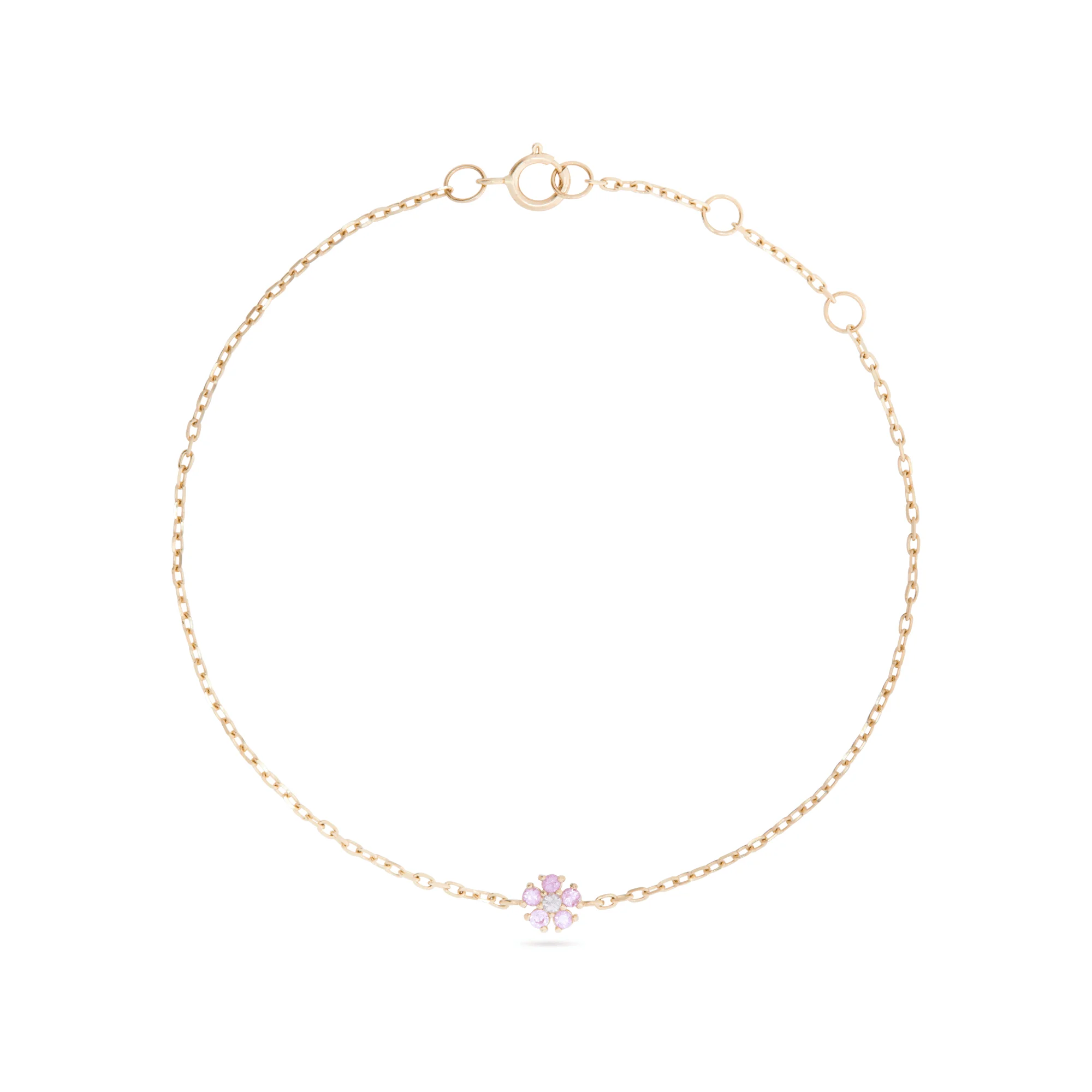 - White diamond - Pink sapphire - Adjustable chain length: 6-7" - 10K Solid yellow gold Additional Information Infuse your jewelry collection with a little color. Our gemstone pieces are designed to add a splash of creativity and whimsy to your look. Since we use all-natural gems, each unique stone is cut to the perfect size and shape. Your piece is meant especially for you. As our gemstones are ethically earth-mined and collected only in quantities that we can source, our gemstone designs are always limited edition and handcrafted into something exceptional with the best value.