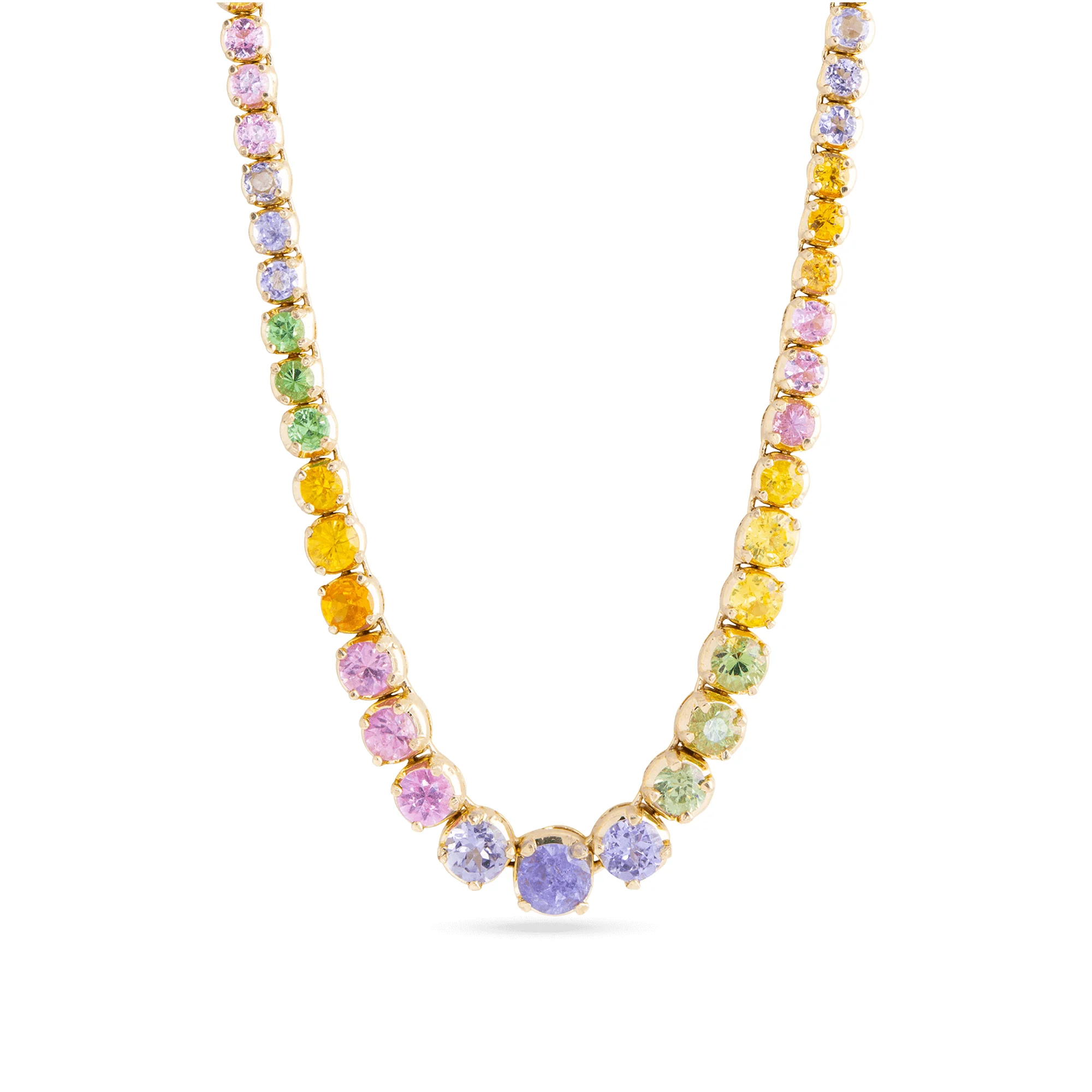 - Please note that every necklace is unique and stone colors will slightly vary - All carat weights are approximate Stones Total Weight (CTW): 5ct (approx) Gemstones: Sapphire / Peridot / Tanzanite Metals Metal Type: 10K Gold Metal Color: Yellow Gold Dimensions Length: 16" Additional Information Infuse your jewelry collection with a little color. Our gemstone pieces are designed to add a splash of creativity and whimsy to your look. Since we use all-natural gems, each unique stone is cut to the perfect size and shape. Your piece is meant especially for you. As our gemstones are ethically earth-mined and collected only in quantities that we can source, our gemstone designs are always limited edition and handcrafted into something exceptional with the best value.
