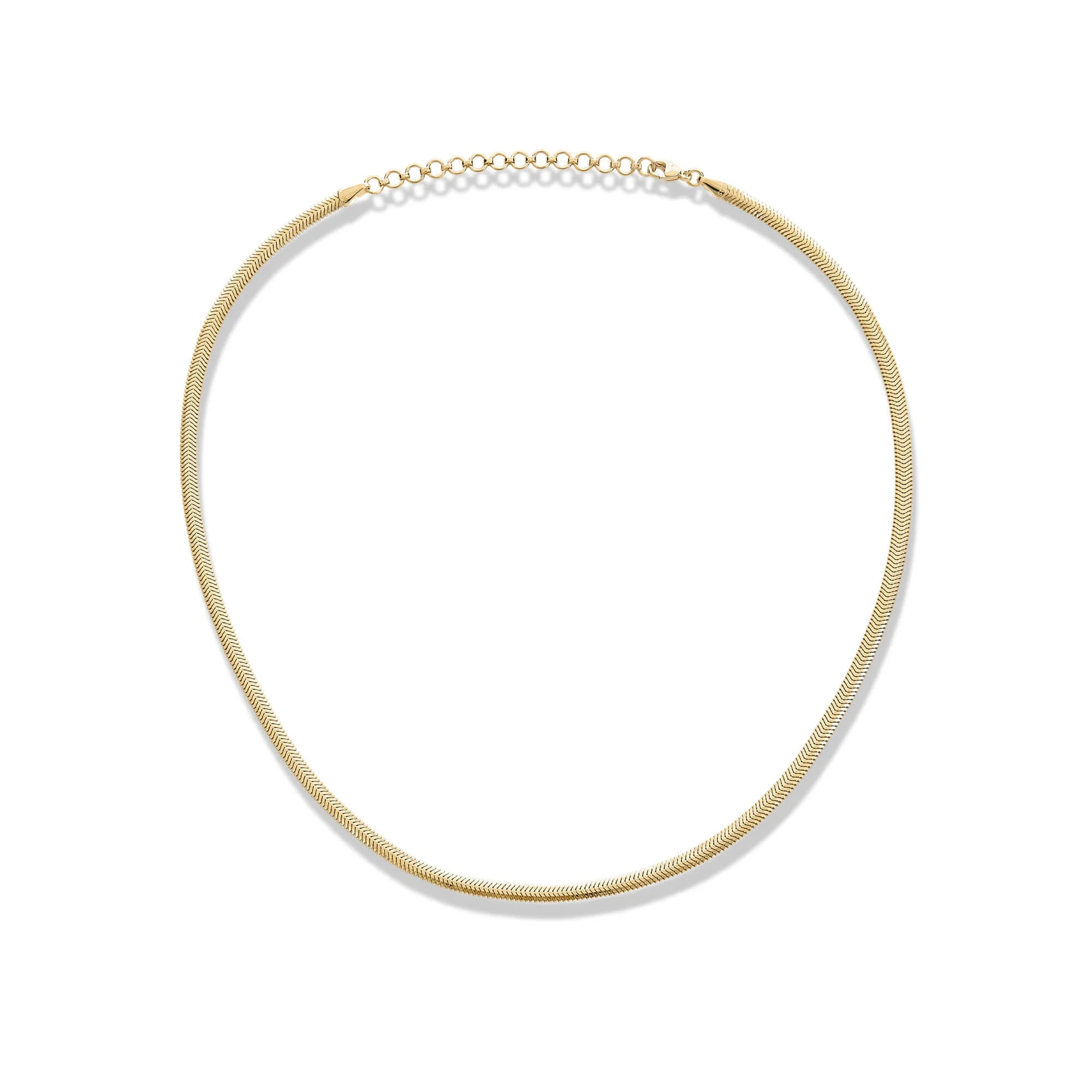 - Serpentine chain - Lobster clasp Metals Metal Type: Gold Metal Color: Yellow Gold Metal Finish: High Polish Gold Karat: 14K Dimensions Width: 3.4mm (approx) Size: 16" - 18" Additional Information We're forever fans of solid gold — it's the perfect material for crafting our collection of timeless, everyday jewelry . We focus on creating a range of staples made from materials of the very highest quality - namely 100% solid gold that won't tarnish or flake. And, because it's our goal to always be fair with our pricing, we offer the best value for these never-take-off styles.