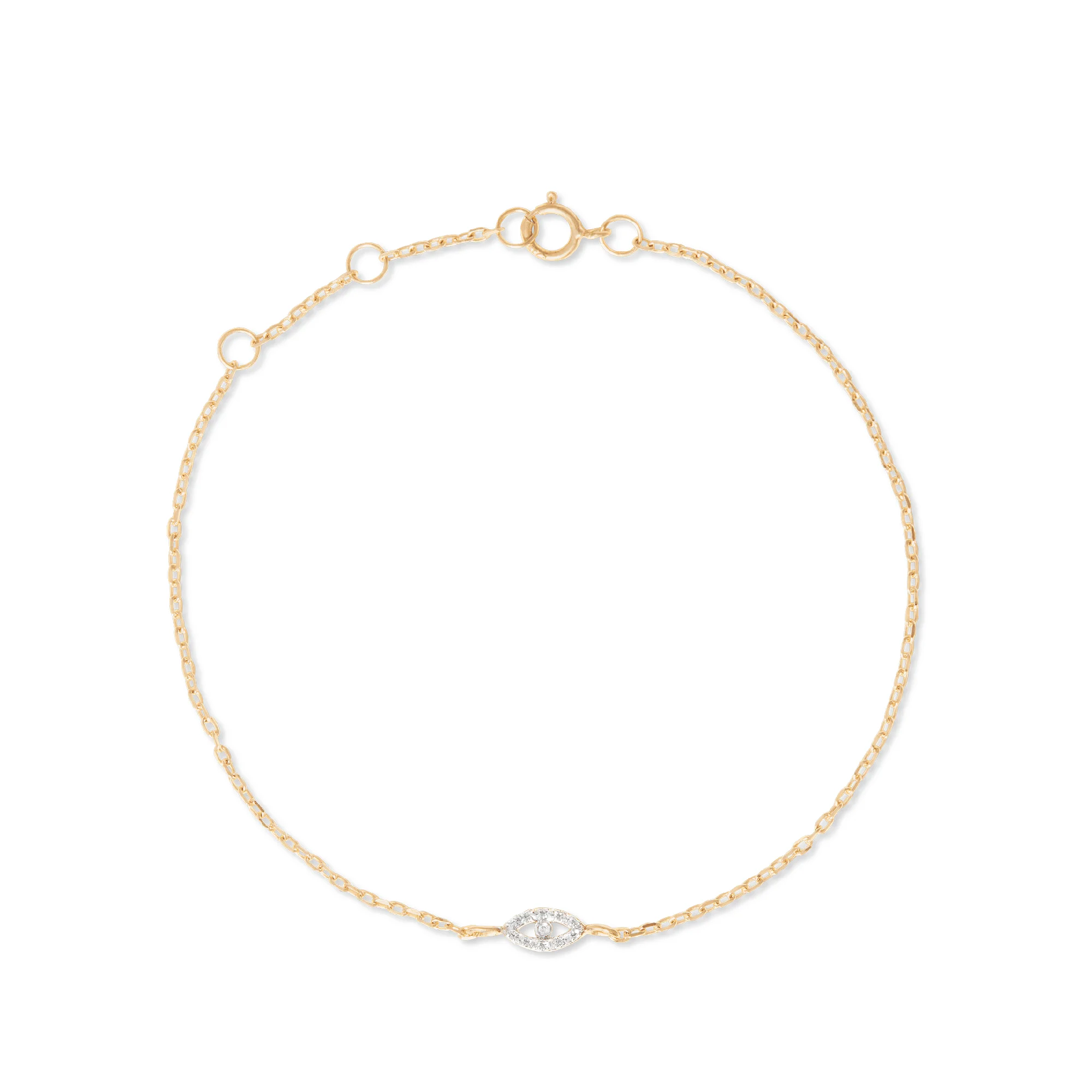 - Handpicked very good cut - Adjustable chain length: 6.5"-7.5" - Ethically sourced materials and conflict free diamonds - White diamond: 0.03TCW (approx) - Evil Eye measurement: 3.5x7mm - Fully compliant with The Kimberley Process - Diamond color/clarity: GH/SI - 10K Solid yellow gold Additional Information It's hard to resist the sparkly spread of pave diamonds, nestled together side by side. Our pieces are hand-set under a microscope, meaning that even the smallest details get our full attention. Every diamond counts. Still, our ultimate goal when making jewelry is to give you the best value, which means conflict-free diamonds and solid gold, and a price that is fair. We believe that you can't ever go wrong with more sparkle, so we do our best to give you everything you deserve.