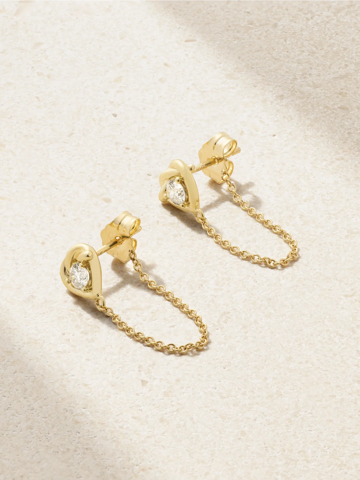 Whether you're gearing up for the big day or reveling in post-wedding bliss, STONE AND STRAND's 'Tie The Knot' earrings are a beautiful choice. They have diamond posts and delicate 10-karat gold chains that drape elegantly around your lobe.