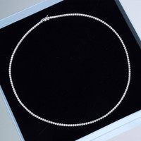 - Ethically sourced materials and conflict free diamonds - Fully compliant with The Kimberley Process - All carat weights are approximate - Hand selected natural white diamonds - Not compatible with our Necklace Extender. Please email us to enquire about a longer length - Box clasp closure with safety clasp Stones Total Weight (CTW): 5.7ct (approx) Stone Type: Natural White Diamonds Color: GH Clarity: SI1-2 Metals Metal Type: Gold Metal Color: White Gold Metal Finish: High Polish Gold Karat: 14K Dimensions Length: 16.5" Additional Information Our founder, Nadine, noticed her tennis necklace was always flipping backward. After working with multiple jewelers to try and fix it to no avail, we knew we had to find a solution. We spent months researching and developing a tennis necklace with the right weight distribution and link settings to solve this problem. We are very excited to launch our new Unflippable Tennis Necklace today. If you're only going to buy one tennis necklace, this is the one. Not only does it not flip, but it's designed with solid 14k white gold and GH/SI2 ethically sourced natural white diamonds in a brilliant cut. The white gold, while classic, also creates a more secure clasp. The prong setting keeps the stones secure, while showing all the sparkle.