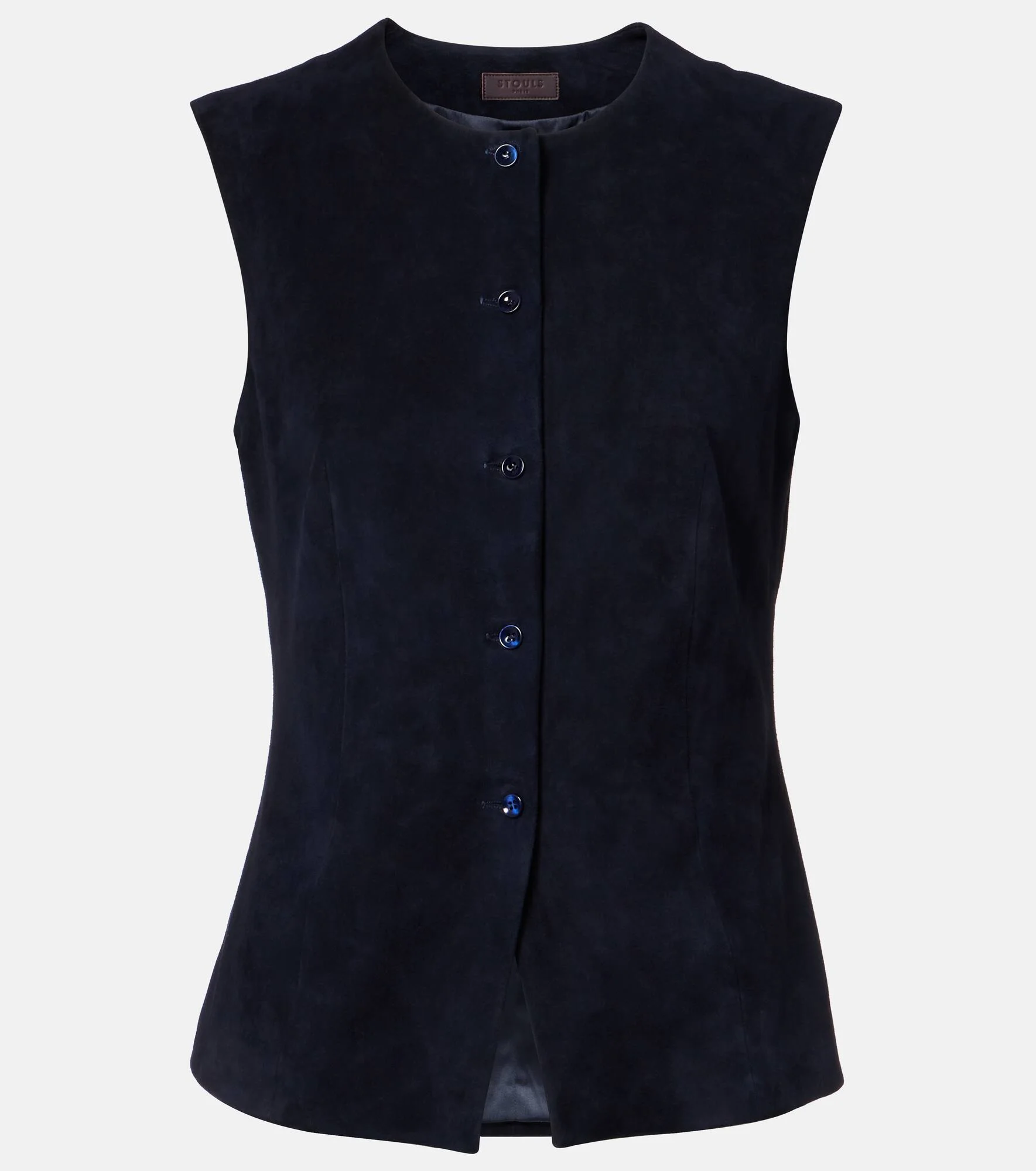 Count on Stouls for refined, skillfully crafted separates – including this Casino vest. The streamlined design is made from suede for a smooth feel and features a buttoned front. Product Details - Material: 100% lamb leather (suede) - Care instructions: machine wash at 30 degrees - Made in Portugal - Color: blue - Designer color name: Notte - Material II: 97% cotton, 2.4% lyocell, 0.6% elastane - Lining: 95% silk, 5% elastane - Closure: buttoned front - Includes: garment bag - Item number: P01118609 Size & Fit - True to size - Cinched waist - Slightly stretchy fabric - Falls to the hip - The model seen in the picture is 178cm-5'10" and wearing a size XS