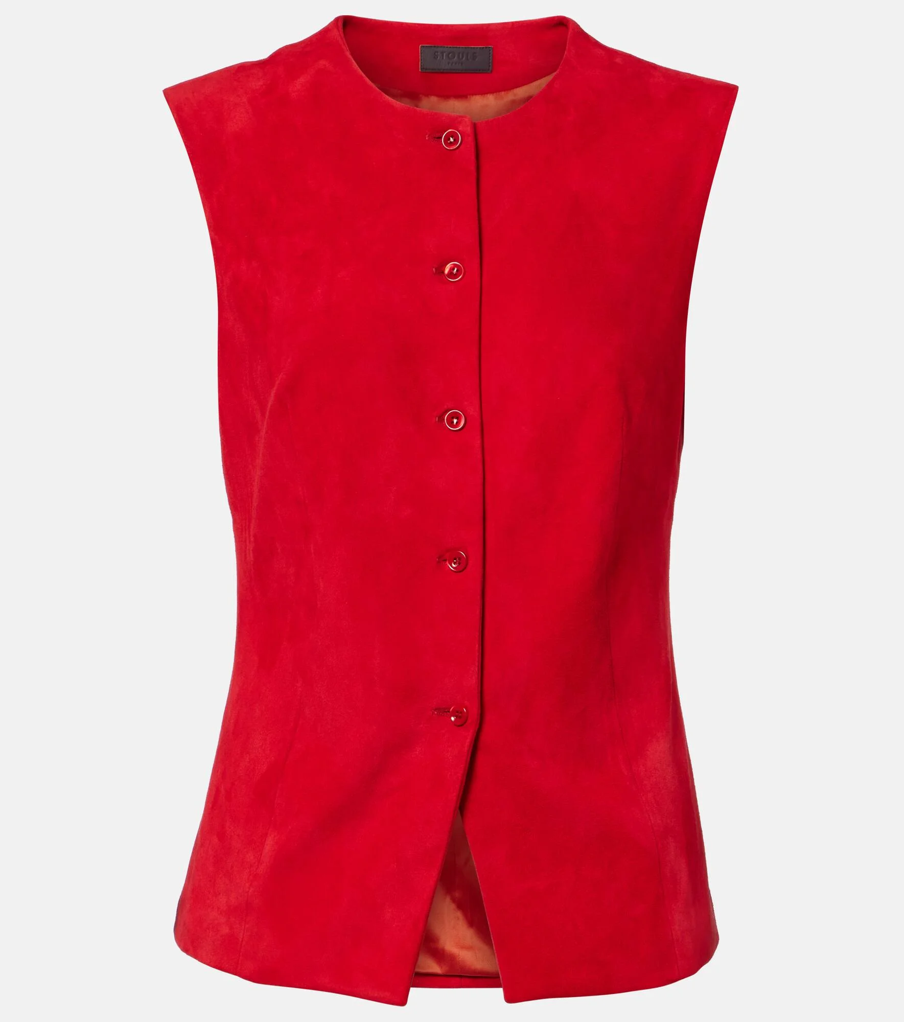Count on Stouls for refined, skillfully crafted separates – including this Casino vest. The streamlined design is made from suede for a smooth feel and features a buttoned front. Product Details - Material: 100% lamb leather (suede) - Care instructions: machine wash at 30 degrees - Made in Portugal - Color: red - Designer color name: Coquelicot - Material II: 97% cotton, 2.4% lyocell, 0.6% elastane - Lining: 95% silk, 5% elastane - Closure: buttoned front - Includes: garment bag - Item number: P01118602 Size & Fit - True to size - Cinched waist - Slightly stretchy fabric - Falls to the hip - The model seen in the picture is 178cm-5'10" and wearing a size XS