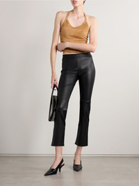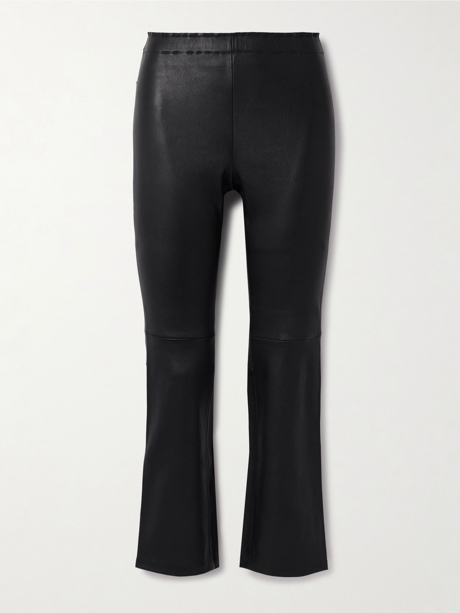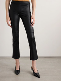STOULS is an expert when it comes to luxurious wardrobe staples that are easy to care for, like these machine-washable leather leggings. They sit high the waist and fall to flared, cropped cuffs. Size & Fit - Fits true to size, take your normal size - Mid-rise, cut for a slim fit with a flared hem - Cropped length - Supple, slightly stretchy leather - Model is 180cm/ 5'11" and is wearing a size Small Details & Care - Black leather - Pull on - 100% leather (Lamb); lining: 87% cotton, 2.4% Lyocell, 0.6% elastane - Machine wash or specialist clean