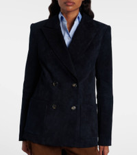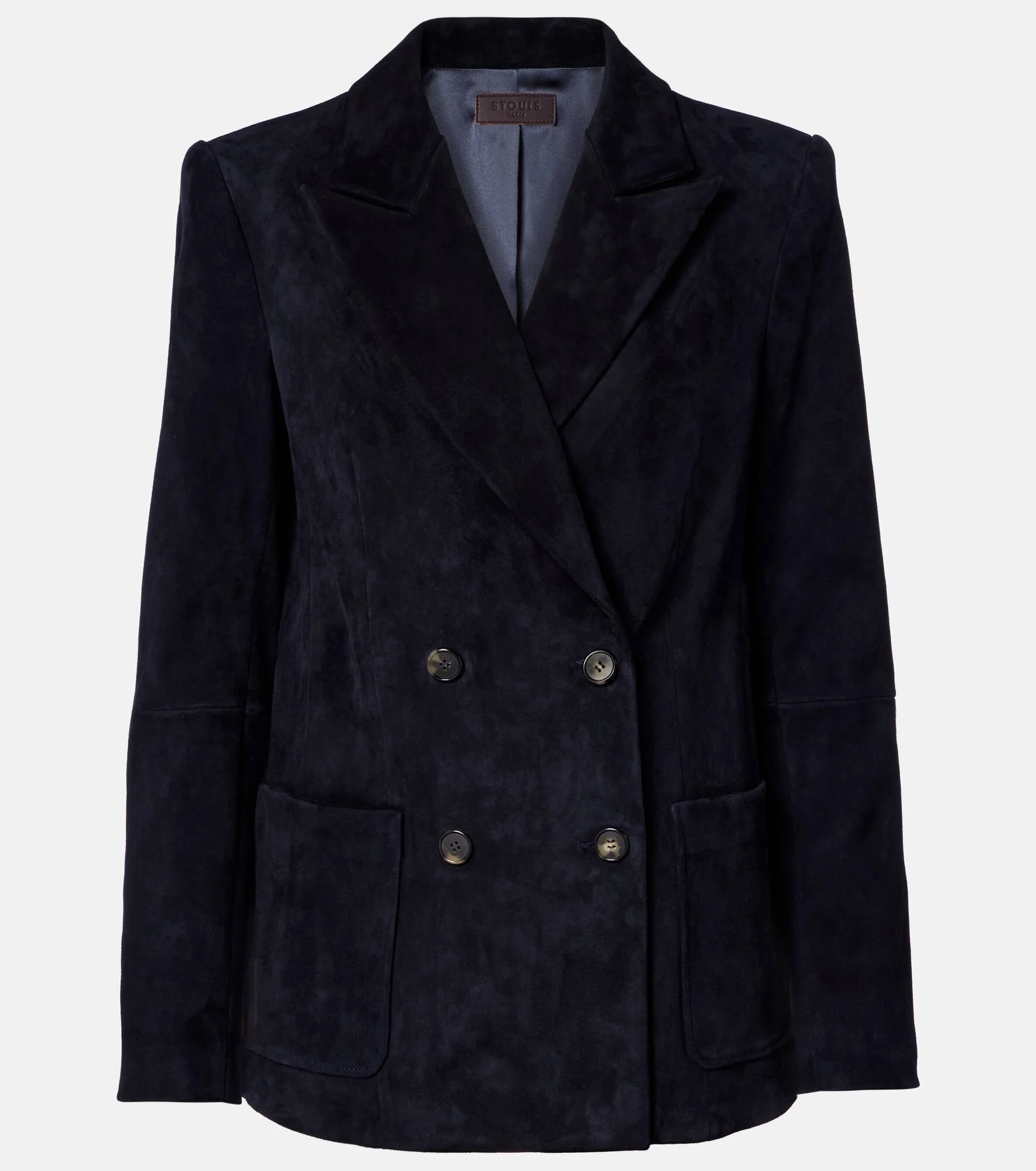 Add sophistication to your everyday looks with this blazer from Stouls. The double-breasted design is crafted from supple suede and features patch pockets. Product Details - Material: 100% lamb leather (suede) - Care instructions: specialist clean - Made in Portugal - Designer color name: Navy Notte - Item color: blue - Material II: 97% cotton, 2.4% lyocell, 0.6% elastane - Lining: 95% silk, 5% elastane - Peak lapel - Closure: double-breasted (four buttons) - Pockets: patch pockets - Shoulder pads - Includes: garment bag - Item number: P01068904 Size & Fit - True to size - Shoulder pad inserts - Cinched waist - Non-stretchy fabric - Falls below the hip - The model seen in the picture is 178cm-5'10" and wearing a size XS