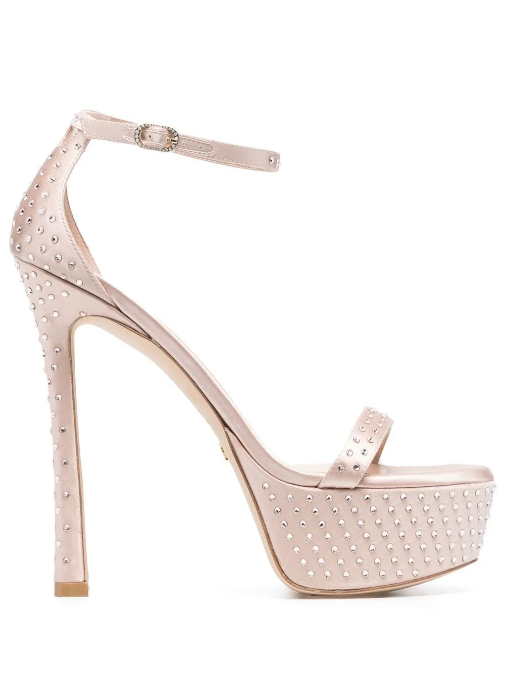150mm rhinestone platform sandals light pink calf leather satin finish rhinestone embellishment open toe buckle-fastening ankle strap rubber sole platform sole Imported Composition Outer: Satin 100%, Sapphire Crystal 100% Sole: Leather 100% SIZE & FIT Measurement HEEL 5.9 in(15 cm) PLATFORM 1.96 in(5 cm)