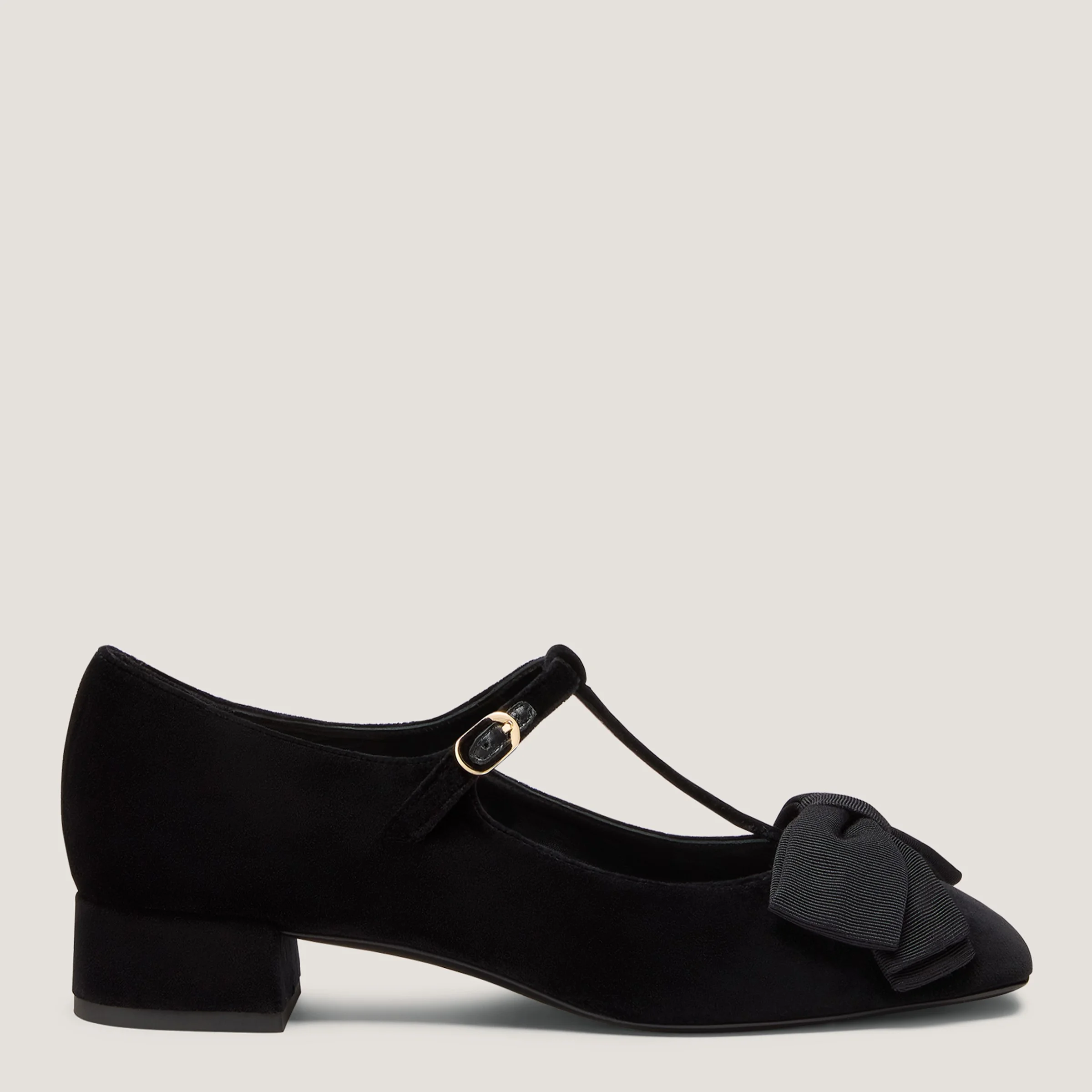 The ARIELLA T-STRAP PUMP reimagines a timeless silhouette with an ultra-feminine sensibility. This style is crafted in Spain and features an oversized bow detail and a wearable 25-mm block heel. MEASUREMENTS Heel Height: 1", 25 mm All measurements are made on a size 6 shoe. There may be slight measurement variations based on size. FEATURES Pump Block heel Almond toe T-strap construction Oversized bow detail Adjustable vamp strap MATERIALS Silk Velvet & Grosgrain Leather insole Leather outsole MADE IN Spain