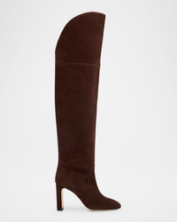 Stuart Weitzman "Babette Tubo" overtheknee boots in supple calfskin suede 3.25 in / 85 mm covered block heel Almond toe Pullon style Leather lining and outsole Professional cleaning recommended Made in Spain
