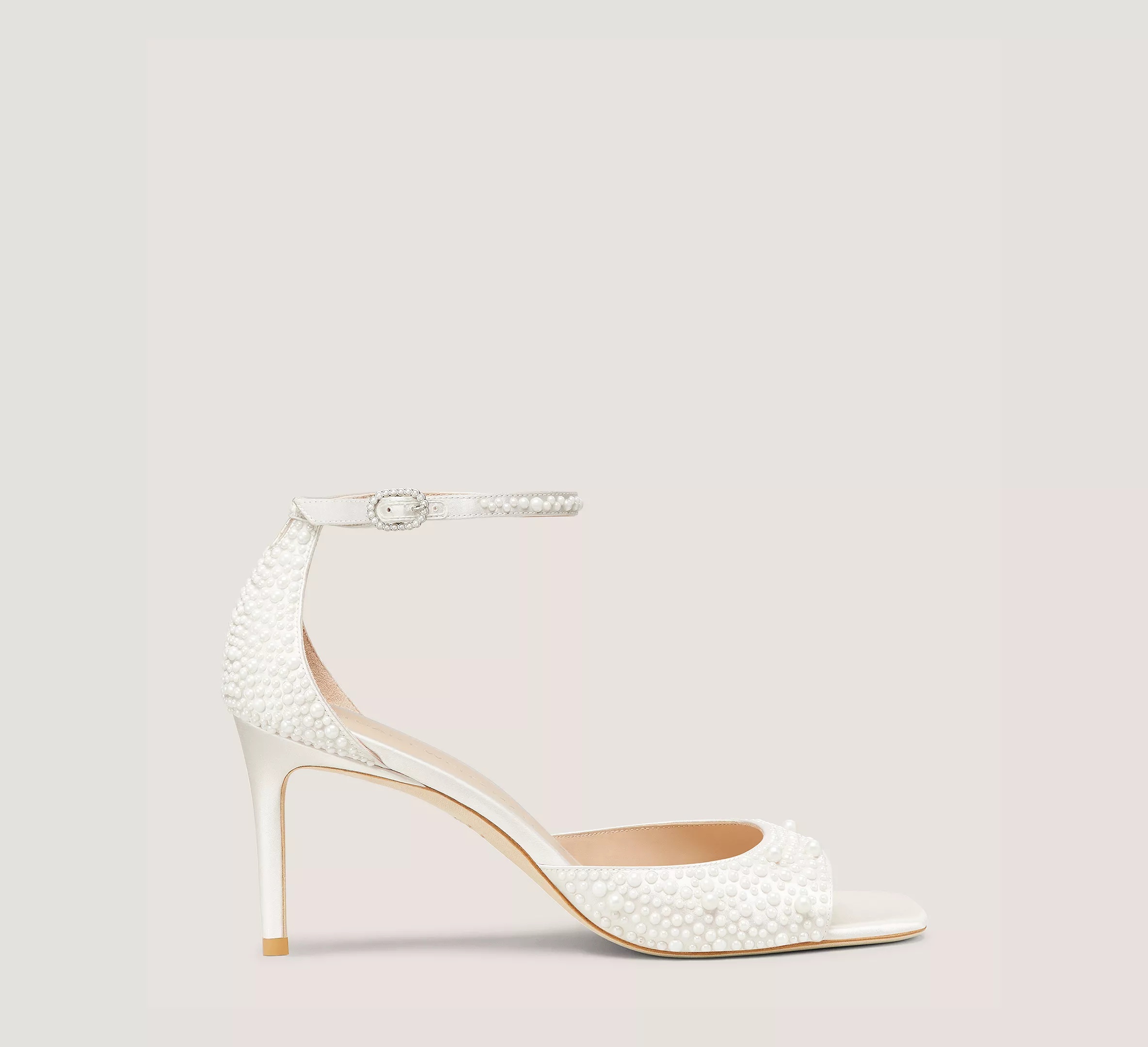 EDITOR'S NOTES The BLISS 75 SANDAL dials up the glamour of our minimalist square-toe sandal silhouette. Part of our Bridal Bliss Capsule Collection of timeless silhouettes designed to make your big day even more unforgettable, this look stands out with over 1,600 hand-applied pearl embellishments. It is constructed with a flattering low-cut vamp, a sleek adjustable ankle strap and set on a 75-mm stiletto heel that does not sacrifice comfort. PRODUCT DETAILS MEASUREMENTS Heel Height: 3", 75 mm All measurements are made on a size 6 shoe. There may be slight measurement variations based on size. FEATURES Sandal Stiletto heel Rounded square-toe Hand-applied pearl embellishments Low-cut vamp Adjustable ankle strap Part of the Bridal Bliss Capsule Collection MATERIALS Satin & Pearls Leather insole Leather outsole MADE IN Spain