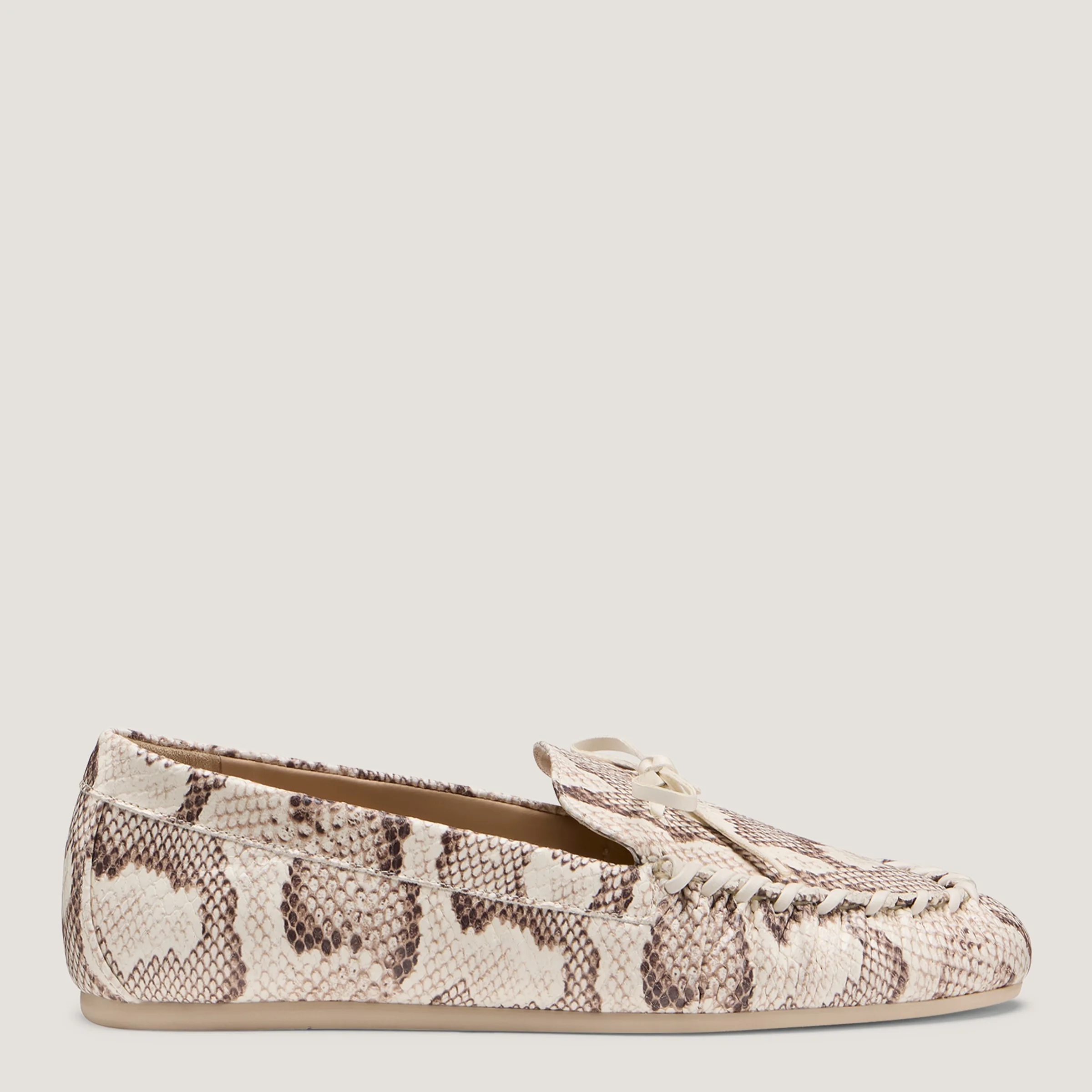 The BRITT BOW LOAFER delivers our modern take on the classic driver silhouette. This timelessly streamlined design is made in Spain and features softly pinched details along the toe, a tonal bow accent and a flat block heel for wear-all-day comfort. MEASUREMENTS Heel Height: 0.2", 5 mm All measurements are made on a size 6 shoe. There may be slight measurement variations based on size. FEATURES Loafer Almond toe Driver Bow detail MATERIALS Snake-Print Leather, Croco-Print Leather or Leather Leather insole Rubber outsole MADE IN Spain