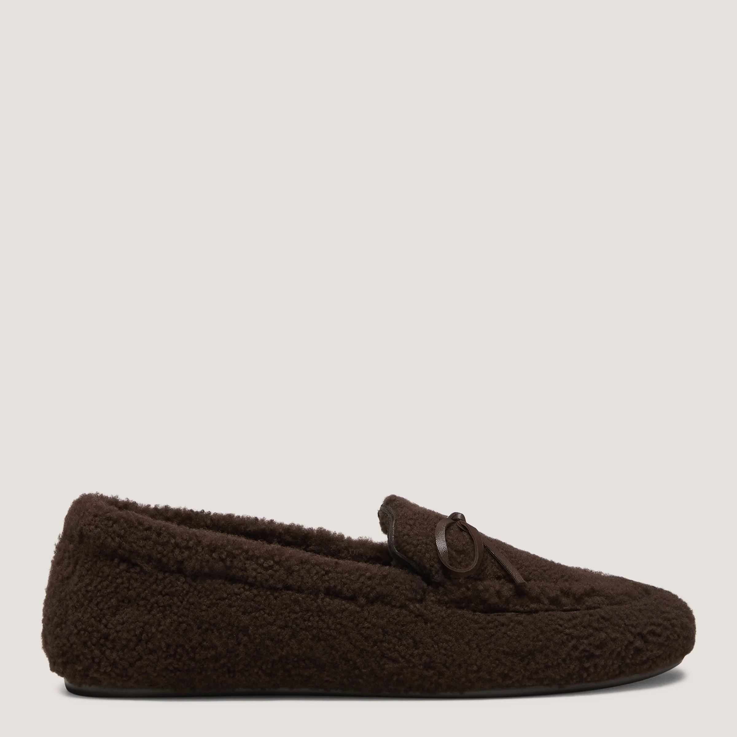 The BRITT BOW SHEARLING LOAFER is our take on the timeless driver — with an apres-ski spin. It is luxurious from start to finish, crafted by our artisans in Spain from shearling complete with a cozy shearling lining. It is detailed with a sleek bow accent and finished with a flat block heel. MEASUREMENTS Heel Height: 0.2", 5 mm All measurements are made on a size 6 shoe. There may be slight measurement variations based on size. FEATURES Loafer Almond toe Driver Shearling lining Bow detail MATERIALS Wavy Shearling Leather insole Rubber outsole MADE IN Spain