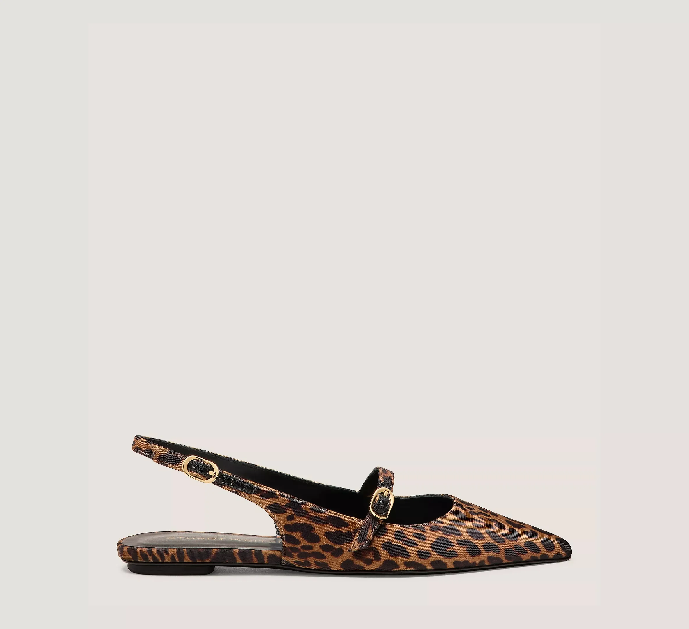 EDITOR'S NOTES The EMILIA MARY JANE SLINGBACK pairs two must-have looks — the slingback and Mary Jane — to create one sophisticated wardrobe essential. Crafted by SW artisans in Spain, this pointed-toe flat features a sleek, streamlined silhouette that can be easily dressed up or down depending on your mood. PRODUCT DETAILS MEASUREMENTS Heel Height: 0.2", 5 mm All measurements are made on a size 6 shoe. There may be slight measurement variations based on size. FEATURES Flat Pointed toe Adjustable slingback and vamp straps MATERIALS Leopard Nylon Leather insole Leather outsole MADE IN Spain