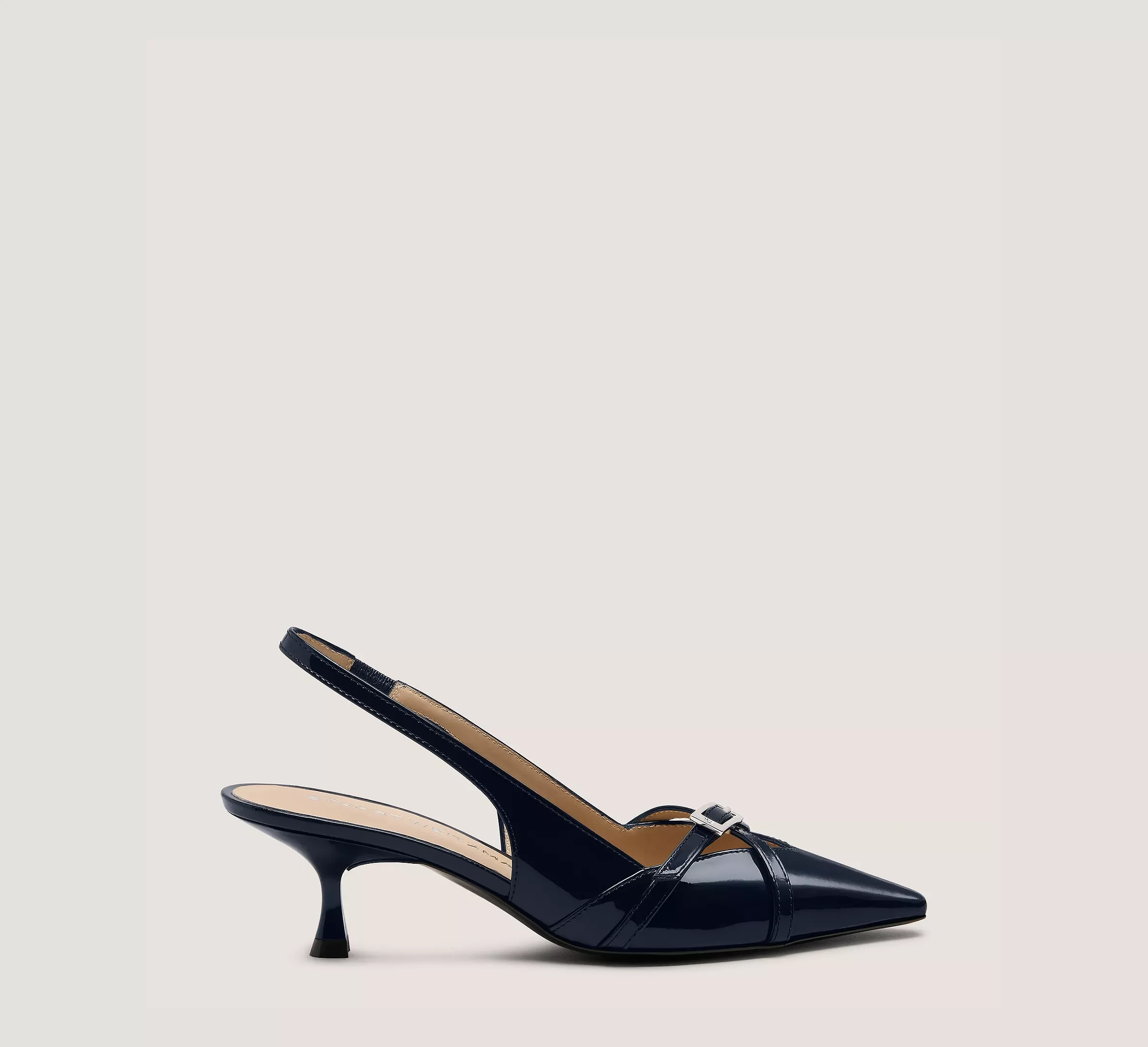 EDITOR'S NOTES The GEORGIE SLINGBACK 50 stands out with sleek, sharp lines, from its precisely sculpted 50-mm kitten heel to its pointed toe. This design features a peekaboo cutout detail and a vamp strap complete with a polished angular buckle. Its slingback strap is designed with an elastic insert for a secure fit. PRODUCT DETAILS MEASUREMENTS Heel Height: 2", 50 mm All measurements are made on a size 6 shoe. There may be slight measurement variations based on size. FEATURES Pump Sculptural Heel Pointed toe Vamp strap with angular buckle detail Slingback with elastic insert MATERIALS Patent leather Leather insole Leather outsole