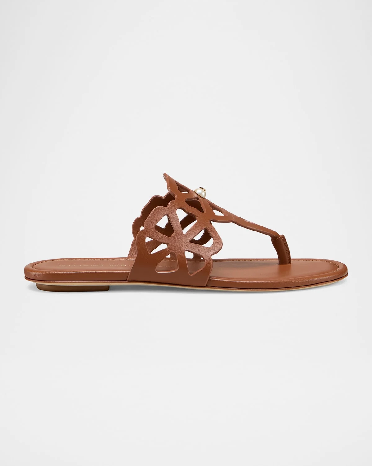 - Stuart Weitzman "Jasmine" smooth calf leather sandals with floral-inspired cutout detailing and a pearly stud logo medallion accent - 0.17 in / 5 mm flat heel - Thong strap - Caged, T-strap vamp - Slide style - Leather outsole - Lining: Leather - Spot clean, hand wash - Imported - Shipping - Direct from Vendor, usually ships within 30 business days.
