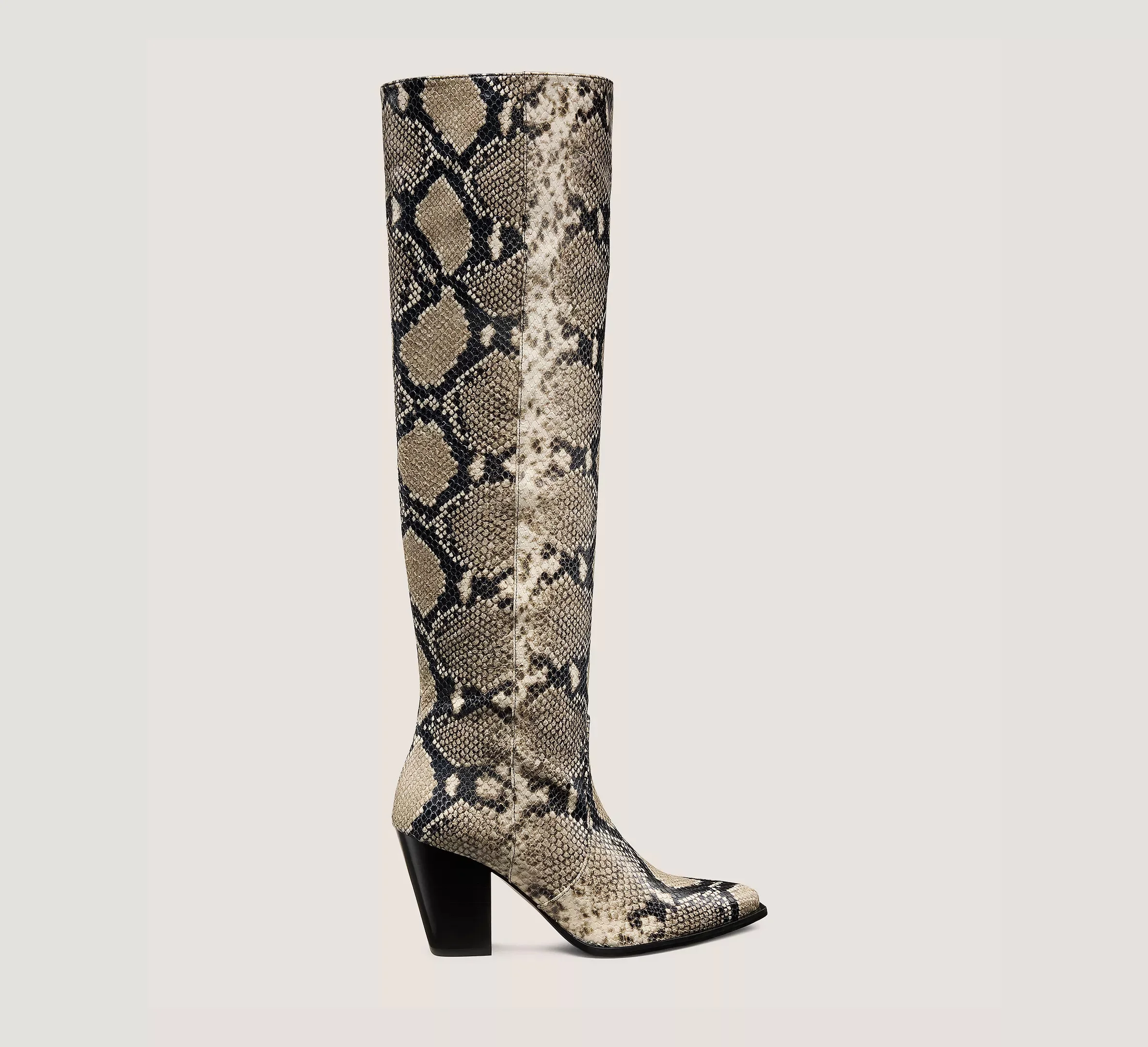 EDITOR'S NOTES Drawing upon the classic cowboy style, the JOLENE BOOT features modernized Western-inspired details. This knee-high boot is made in Spain with a sleek pointed toe that infuses polish into the look and set on a Cuban heel that offers a wearable 75-mm lift. PRODUCT DETAILS MEASUREMENTS Heel Height: 3", 75 mm Shaft Height: 18", 46 cm Shaft Circumference: 15", 38 cm All measurements are made on a size 6 shoe. There may be slight measurement variations based on size. FEATURES Boot Knee-high Sculptural block heel Pointed toe Structured shaft MATERIALS Snake Printed Leather Leather insole Rubber outsole
