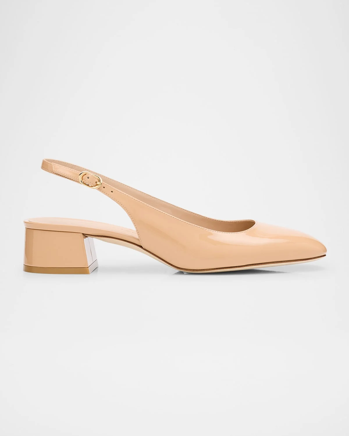 - Stuart Weitzman "Maeve" glossy patent leather ballerina pumps - 1.38 in / 35 mm block heel - Round toe - Adjustable slingback strap - Lining: Leather - Leather outsole - Professional cleaning recommended, hand wash, spot clean - Made in Spain