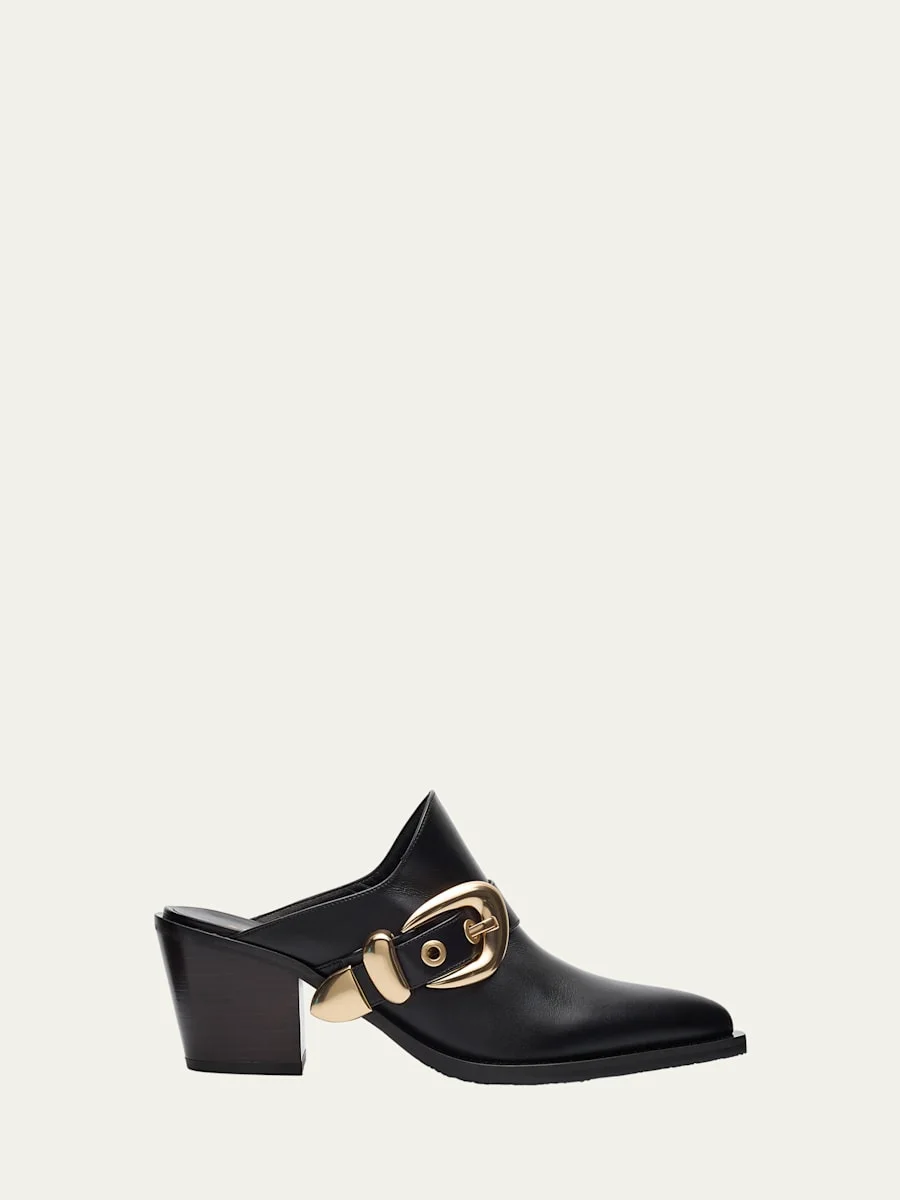 Stuart Weitzman "Maven" western mules in smooth calf leather with a buckle strap accent 2.36 in / 60 mm block heel Pointed toe Notched vamp Easy slide style Leather outsole Lining: Polyurethane Professional cleaning recommended Made in Spain Online Inquiries: BGS21_X6XD3| Store Inquiries: #5036127
