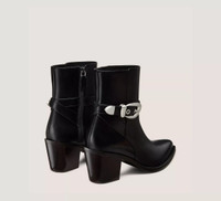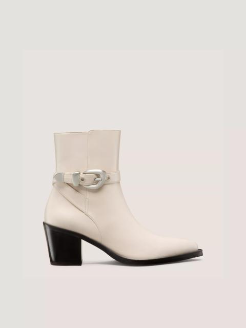 EDITOR'S NOTES True to its name, the MAVEN WESTERN BOOTIE pairs Western-inspired details with our signature minimalist sensibility. The result is a look that is at once timely and timeless. It is crafted by SW artisans in Spain with a striking buckle detail, wearable 60-mm Cuban heel and sleek pointed toe. PRODUCT DETAILS MEASUREMENTS Heel Height: 2.8", 70 mm Shaft Height: 5.9", 15 cm Shaft Circumference: 5.1", 13 cm All measurements are made on a size 6 shoe. There may be slight measurement variations based on size. FEATURES Bootie Ankle Block heel Pointed toe Pull-on Western-inspired buckle MATERIALS Smooth leather Leather insole Leather outsole MADE IN Spain
