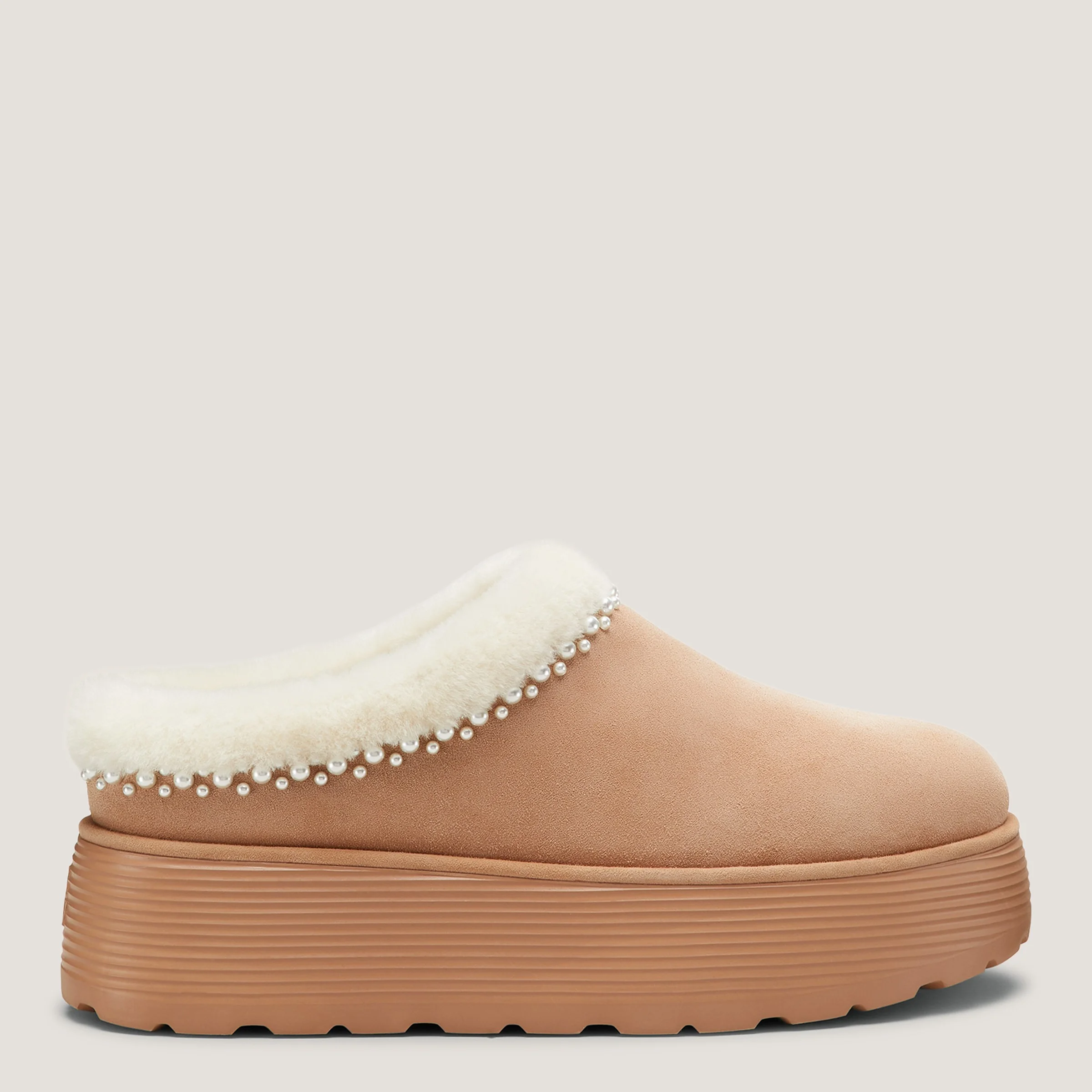 EDITOR'S NOTES The NELLIE PEARL FLATFORM MULE is at once laid-back and luxurious: Crafted by SW artisans in Spain, it features pearl embellishments and is lined in shearling for maximum cozy appeal. A wearable 40-mm flatform completes the look. PRODUCT DETAILS MEASUREMENTS Heel Height: 1.6", 40 mm All measurements are made on a size 6 shoe. There may be slight measurement variations based on size. FEATURES Flat Flatform Round toe Mule Pearl embellishments Shearling-lined MATERIALS Sport Suede & Soft Shearling Leather insole IP EVA Outsole Imported