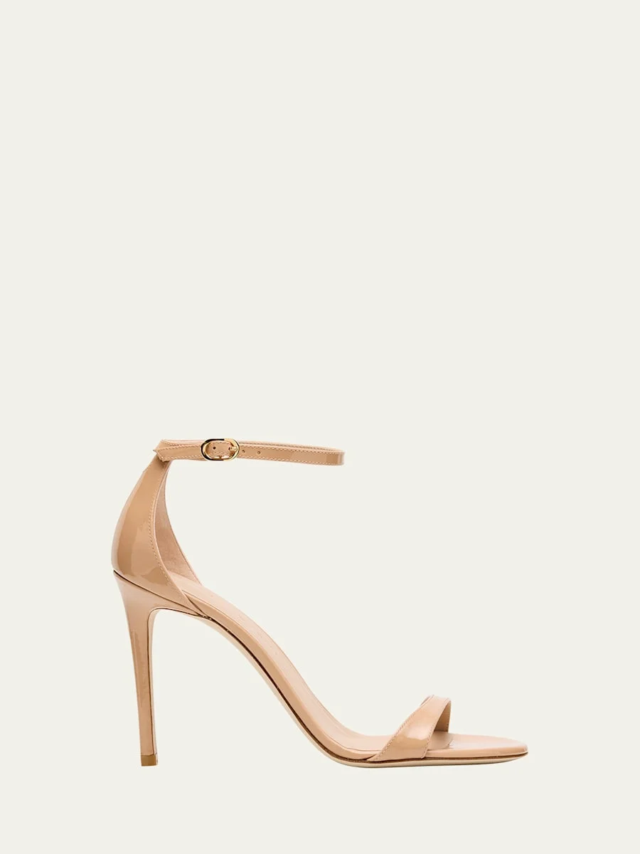 Stuart Weitzman "Nudist II" patent leather sandals 4.00 in / 100 mm stiletto heel Open toe Adjustable ankle strap Leather outsole Lining: Leather Professional cleaning recommended Made in Spain