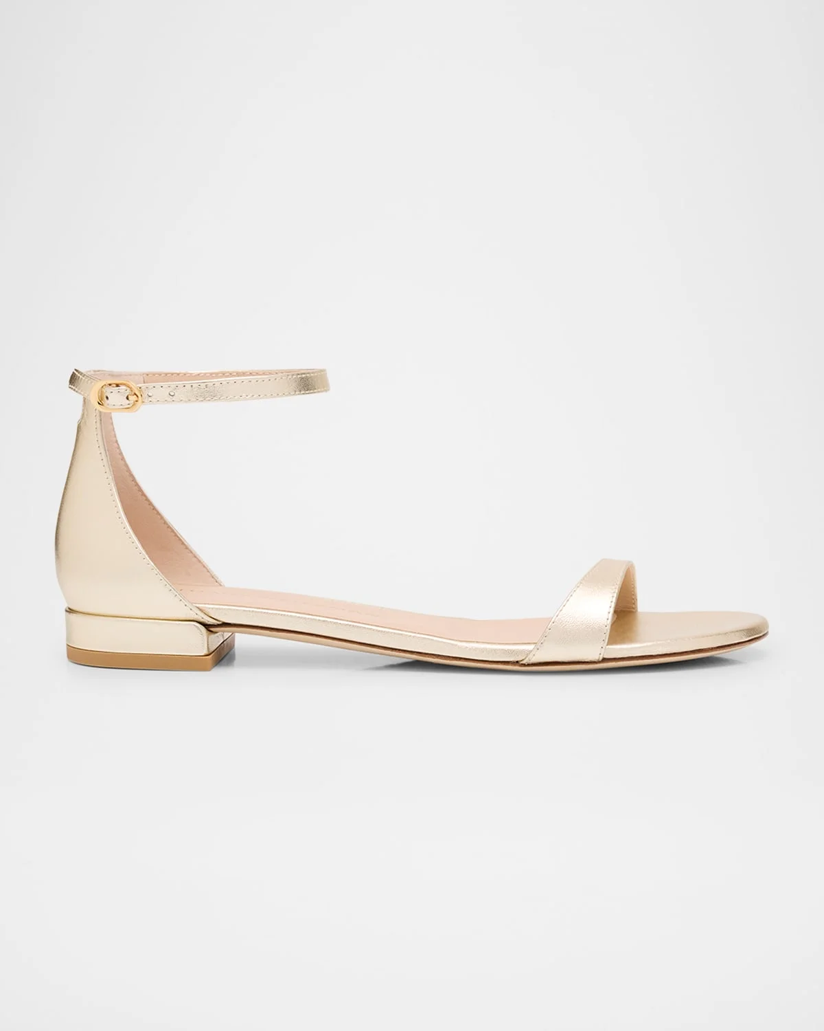 - Stuart Weitzman "Nudist" metallic leather sandals - 0.50 in / 15 mm flat heel - Open toe - Adjustable ankle strap - Leather outsole - Lining: Leather - Made in Spain
