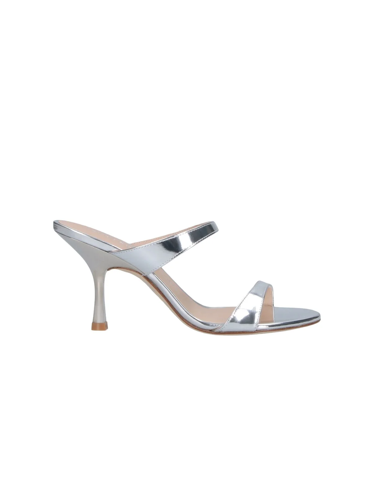 STUART WEITZMAN NUDIST SLIDE 85 SANDALS IN SILVER CALF LEATHER WITH OPEN ROUND TOE, THIN TOP BAND, SLIP-ON FIT, AND LEATHER SOLE. PRODUCT INFO PRODUCT CODE SL462SLV COMPOSITION: 100% CALF LEATHER SIZE AND FIT: HEEL HEIGHT 8.5 CM MADE IN: SPAIN - SOLE: 100% LEATHER