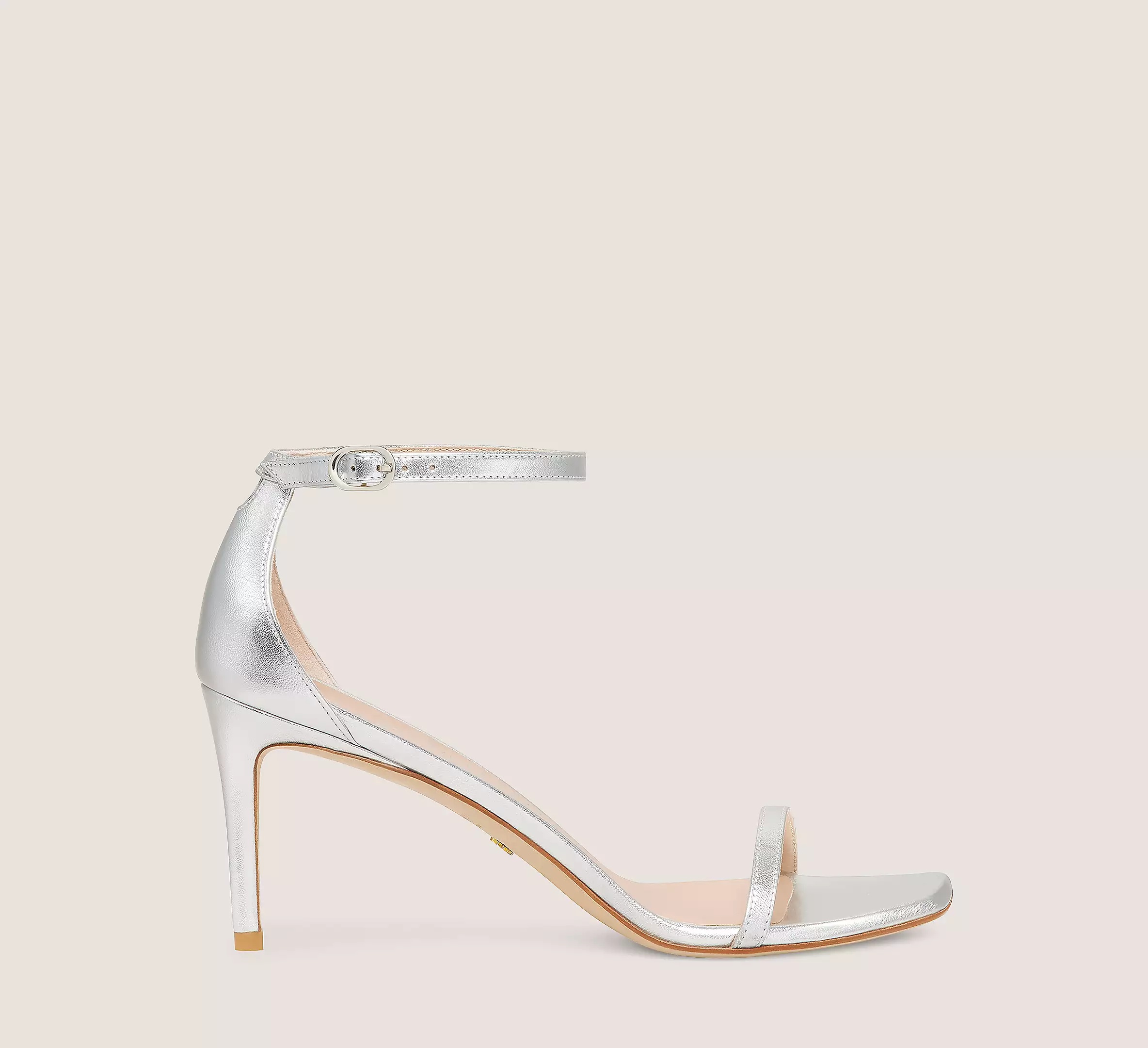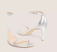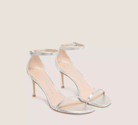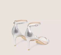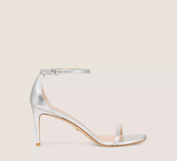 EDITOR'S NOTES The NUDISTCURVE 75 SANDAL delivers the minimalist glamour of our iconic double-strap sandal silhouette — on an even-more wearable 75-mm stiletto heel. It is meticulously crafted by our artisans in Spain on a slightly curved heel for more support than ever with straps specially engineered to prevent the foot from sliding forward. Its angular square toe is definitively modern and its sleek ankle strap enables it to be adjusted for your own personalized fit. PRODUCT DETAILS MEASUREMENTS Heel Height: 3", 75 mm All measurements are made on a size 6 shoe. There may be slight measurement variations based on size. FEATURES Sandal Stiletto heel Rounded square-toe Adjustable ankle strap Crafted by SW artisans in Spain A Stuart Weitzman icon Part of the NUDIST Collection MATERIALS Liquid Metallic Leather Leather insole Leather outsole MADE IN SPAIN