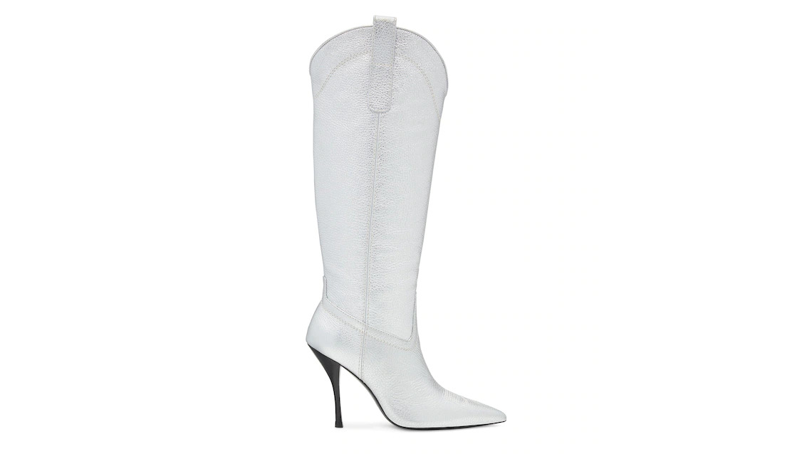 Editor's Notes Master the Western trend — your way — in the OUTWEST 100 BOOT. This luxe knee-high boot nods to the classic cowboy-inspired look with its curved cuff, pull tab and decorative embroidered motif on the vamp. Meanwhile, its striking contrast stitching, sharp pointed toe and slightly curved, 100-mm stacked stiletto heel make it feel definitively fresh. Product Details MEASUREMENTS Heel Height: 3.9", 100 mm Shaft Height: 12.2", 31 cm Shaft Circumference: 14.2", 36 cm All measurements are made on a size 6 shoe. There may be slight measurement variations based on size. FEATURES Boot Knee-high Stiletto heel Pointed toe Pull-on Contrast stitching Decorative embroidery Curved cuff Pull tabs with SW logo detail MATERIALS Metallic pebble leather Leather insole Buffed leather outsole + rubber injection tip with metal star MADE IN SPAIN