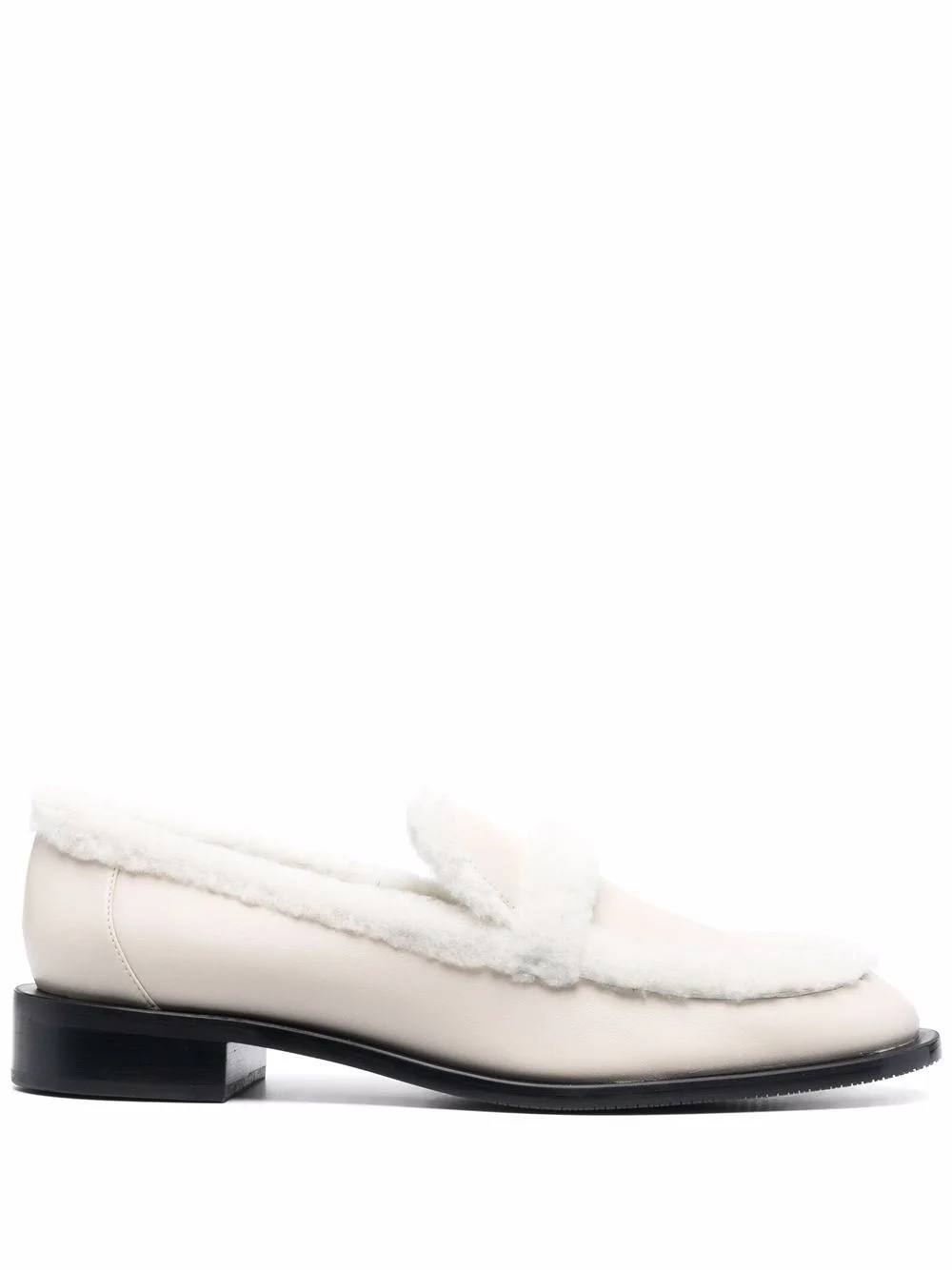 shearling trim loafers white leather round toe slip-on style shearling trim low block heel Imported Composition Leather 100% SIZE & FIT Measurement HEEL 1.37 in(3.5 cm) Sole height 0.39 in(1 cm)