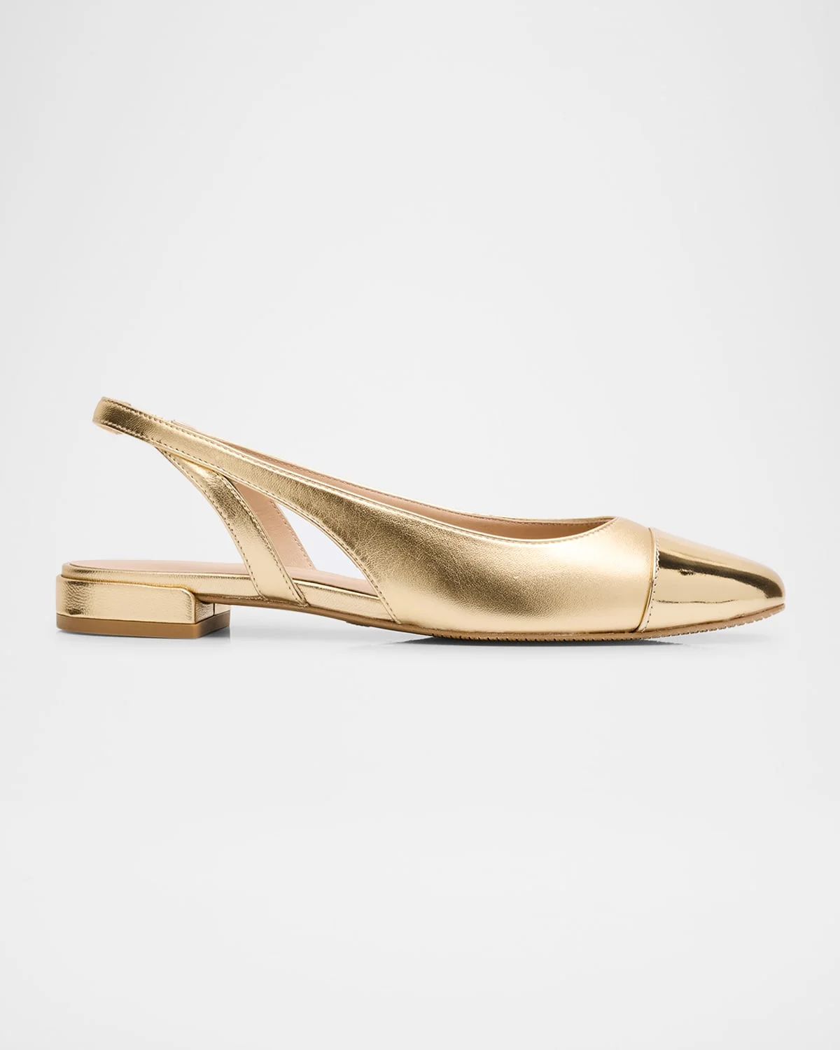 - Stuart Weitzman "Sleek" slingbacks pronounced with a metallic cap toe - 0.25 in / 10 mm flat heel - Almond toe - Elasticized, cutout slingback strap - Slip-on style - Lightweight, sturdy TPU outsole - Lining: Leather - Made in Spain