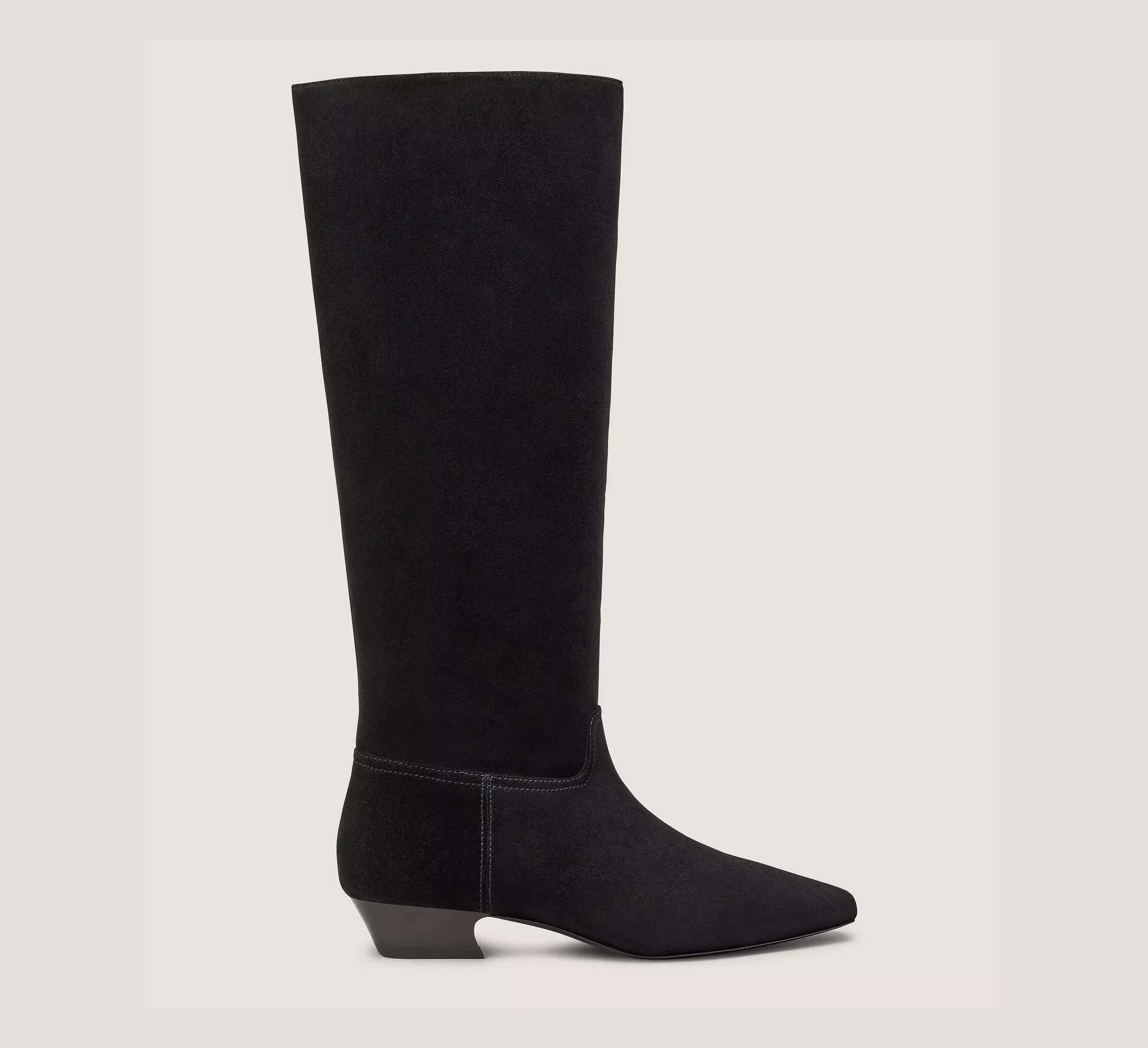 EDITOR'S NOTES The STASSI BOOT reimagines the classic knee-high silhouette with a distinctive sculptural spin. Made in Spain, it is set on an angled block heel for a wearable 50-mm lift and finished with a modern, squared-off pointed toe. PRODUCT DETAILS MEASUREMENTS Heel Height: 1", 25 mm Shaft Height: 15.1", 38 cm Shaft Circumference: 14.2", 36 cm All measurements are made on a size 6 shoe. There may be slight measurement variations based on size. FEATURES Boot Knee-high Sculptural Heel Pointed toe Pull-on Structured shaft MATERIALS Sport suede Leather insole Leather outsole
