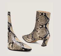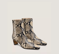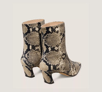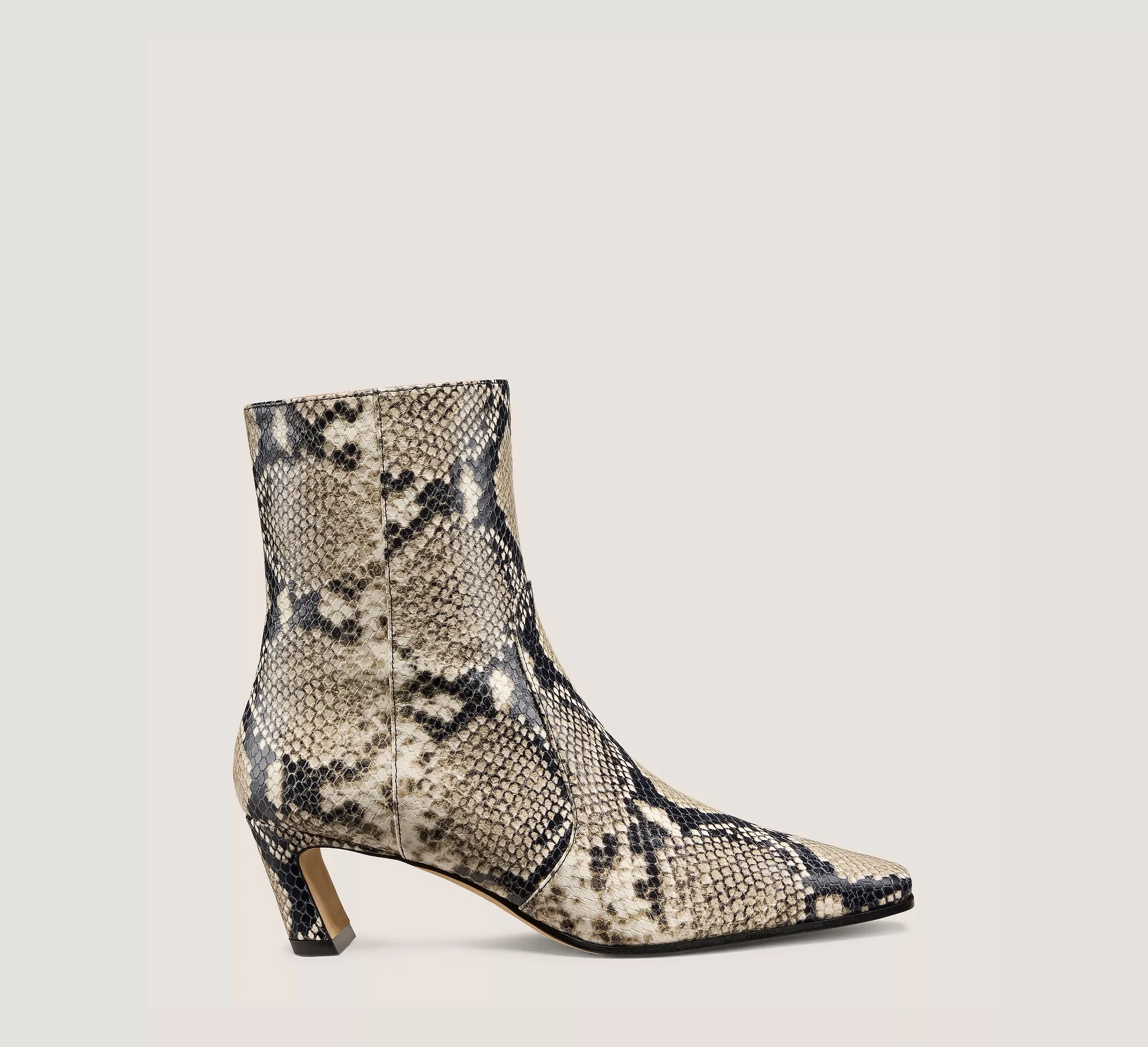 EDITOR'S NOTES The STASSI ZIP BOOTIE delivers our modern take on the everyday ankle boot, defined by an ultra-sleek, sculptural sensibility. It is made in Spain with a distinctive angled slim block heel for a wearable 50-mm lift. PRODUCT DETAILS MEASUREMENTS Heel Height: 2", 50 mm Shaft Height: 5.9", 15 cm Shaft Circumference: 9.8", 25 cm All measurements are made on a size 6 shoe. There may be slight measurement variations based on size. FEATURES Bootie Ankle Sculptural heel Pointed toe MATERIALS Snake Printed Leather Leather insole Leather outsole