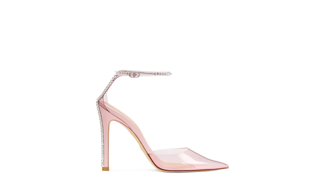 Editor's Notes The STUART GLAM 110 STRAP PUMP stays true to its name with unequivocally glamorous design details that set it apart. These include monochromatic see-through PVC accents, as well as crystal embellishments that line the ankle strap and down the length of its 110-mm stiletto heel to create leg-lengthening effect. It is constructed with exposed sides for a look that nods to our iconic NUDIST sandal, and it secures around the ankle with an adjustable strap that enables you to find your own perfect fit. Product Details MEASUREMENTS Heel Height: 4.3", 110 mm All measurements are made on a size 6 shoe. There may be slight measurement variations based on size. FEATURES Pump Stiletto heel Pointed toe Crystal embellishments Adjustable ankle strap Part of the STUART Collection MATERIALS PVC & crystal Leather insole Buffed leather outsole MADE IN SPAIN