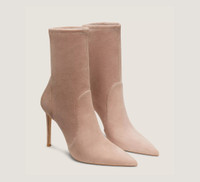 EDITOR'S NOTES With the STUART POWER BOOTIE 100, our iconic pointed-toe STUART BOOTIE design is infused with more style and comfort than ever before. It is crafted by SW artisans in Spain with a reimagined construction for improved support and a 100-mm stiletto heel that's strategically placed on a slight angle for extra stability. Finished with a new shock-absorbing foam insole, it offers increased flexibility while still remaining as sleek as ever. PRODUCT DETAILS MEASUREMENTS Heel Height: 3.9", 100 mm Shaft Height: 6.7", 17 cm Shaft Circumference: 9.8", 25 cm All measurements are made on a size 6 shoe. There may be slight measurement variations based on size. FEATURES Bootie Ankle Stiletto heel Pointed toe Pull-on Sock bootie Industry-leading stretch construction Modernized construction for extra support New foam insole Crafted by SW artisans in Spain A Stuart Weitzman icon Part of the STUART Collection MATERIALS Stretch suede Leather insole Leather outsole MADE IN Spain