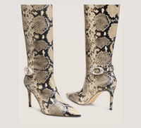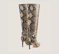 EDITOR'S NOTES The STUART POWER BUCKLE BOOT offers a polished take on our iconic pointed-toe STUART boot design. This ultra-sleek knee-high boot is crafted in Spain with an oversized buckle detail and a 75-mm stiletto heel. PRODUCT DETAILS MEASUREMENTS Heel Height: 3.4", 85 mm Shaft Height: 15", 38 cm Shaft Circumference: 15", 38 cm All measurements are made on a size 6 shoe. There may be slight measurement variations based on size. FEATURES Boot Knee-high Stiletto heel Pointed toe Buckle detail Modernized construction for extra support New foam insole Crafted by SW artisans in Spain A Stuart Weitzman icon Part of the iconic STUART Collection MATERIALS Snake Printed Leather Leather insole Leather outsole