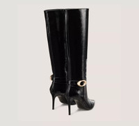 EDITOR'S NOTES The STUART POWER BUCKLE BOOT offers a polished take on our iconic pointed-toe STUART boot design. This ultra-sleek knee-high boot is crafted in Spain with an oversized buckle detail and a 75-mm stiletto heel. PRODUCT DETAILS MEASUREMENTS Heel Height: 3.4", 85 mm Shaft Height: 15", 38 cm Shaft Circumference: 15", 38 cm All measurements are made on a size 6 shoe. There may be slight measurement variations based on size. FEATURES Boot Knee-high Stiletto heel Pointed toe Buckle detail Modernized construction for extra support New foam insole Crafted by SW artisans in Spain A Stuart Weitzman icon Part of the iconic STUART Collection MATERIALS Crinkled Patent Leather Leather insole Leather outsole
