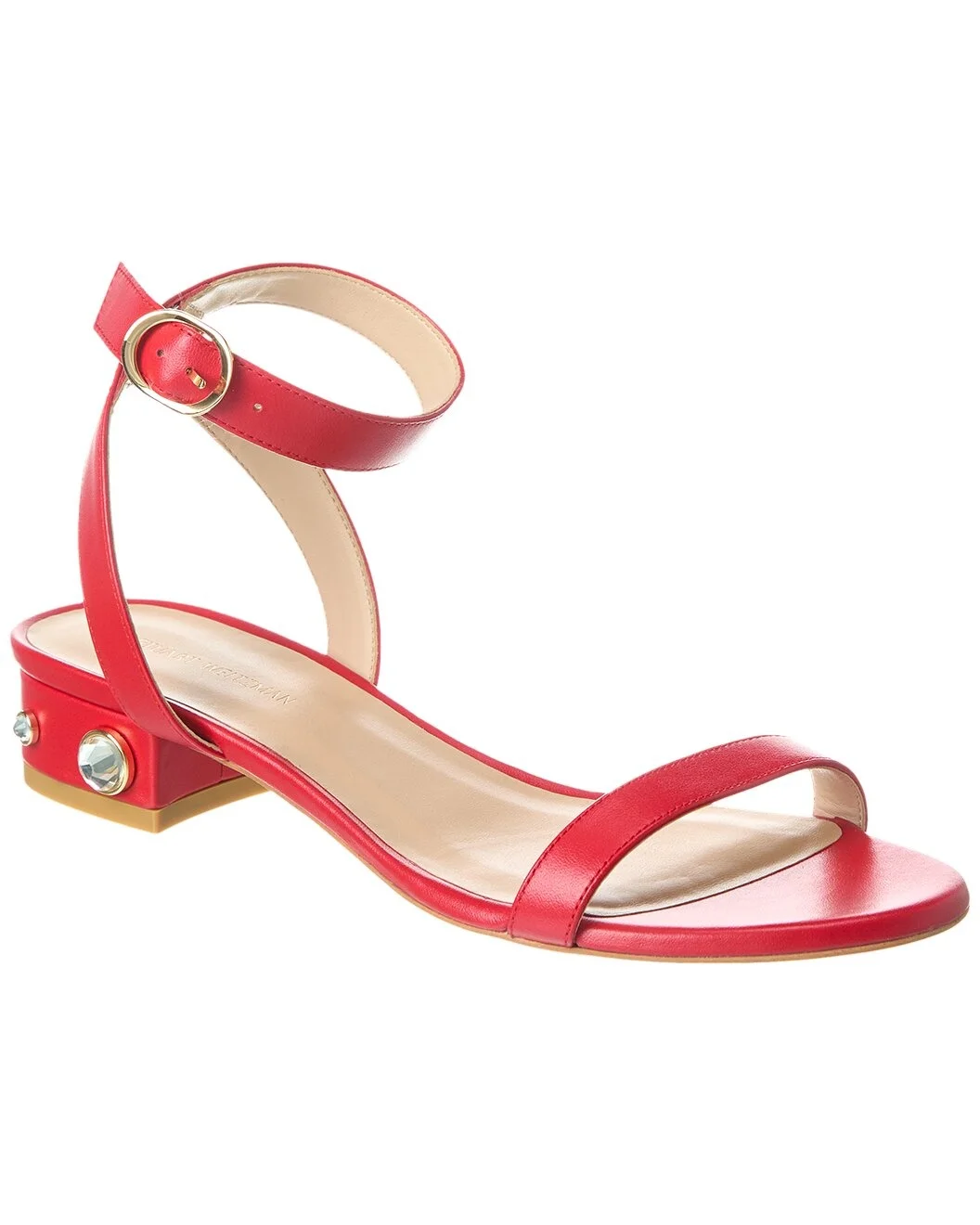 - About the brand: Championing artistry and function in women's footwear. - Dancer Allshine 25 Leather Sandal in lipstick red leather and gold-tone hardware with gem-embellished heel - Adjustable ankle strap with buckle closure - Lightly padded leather insole - Smooth man-made sole with light traction - 1.25in heel - Please note: All measurements are approximate and were taken from a size 7; slight variations may occur. - Made in Spain