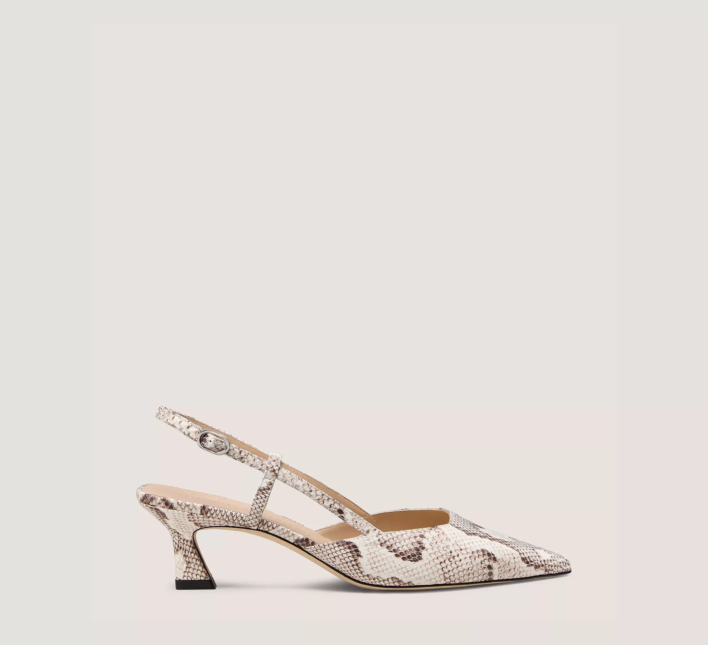 EDITOR'S NOTES The VINNIE 50 SLINGBACK effortlessly melds style and comfort, featuring a sculptural angled 50-mm heel that is strategically placed for extra support. Sleek, architectural lines, from its pointed toe to its squared-off back counter, further elevate the look. PRODUCT DETAILS MEASUREMENTS Heel Height: 2", 50 mm All measurements are made on a size 6 shoe. There may be slight measurement variations based on size. FEATURES Pump Sculptural heel Pointed toe Adjustable slingback strap MATERIALS Snake Printed Leather Leather insole Leather outsole MADE IN Spain