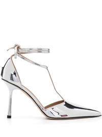 90mm Gisele pumps Highlights - Silver-tone - Faux leather - Mirrored finish - Tie-fastening ankle strap - High sculpted heel - T-bar strap - Pointed toe - Branded insole - Contrast lining - Leather sole Imported Composition Other fibres 100% SIZE & FIT Measurement HEEL 3.74 in(9.5 cm) Sole height 0.39 in(1 cm)