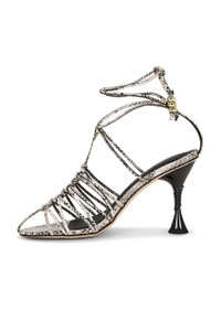 - Tubular leather straps upper with leather sole - Adjustable wrap-around ankle tie closure - Leather footbed and lining - Almond toe - Twisted stiletto heel - Open cage / Strappy silhouette - Heel approx 90 mm / 3.54 inch - Revolve Style No. SAML-WZ47 - Manufacturer Style No. F886CFS