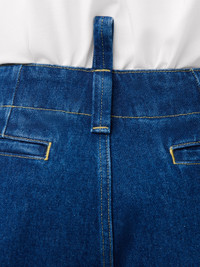 High waisted curved leg denim pant made from ISKO's sustainable R-TWO™ denim. Details: - Flat front - Washed denim fabrication - Full length - Concealed zip-fly with metal button closure - Two side pockets and two rear pockets - Belt loops Emmanuelle is 5’10” / 178cm, she wears a size 1 DETAILS & CARE 71% Cotton, 16% Reused Cotton, 13% Recycled Polyester Wash at 30°C
