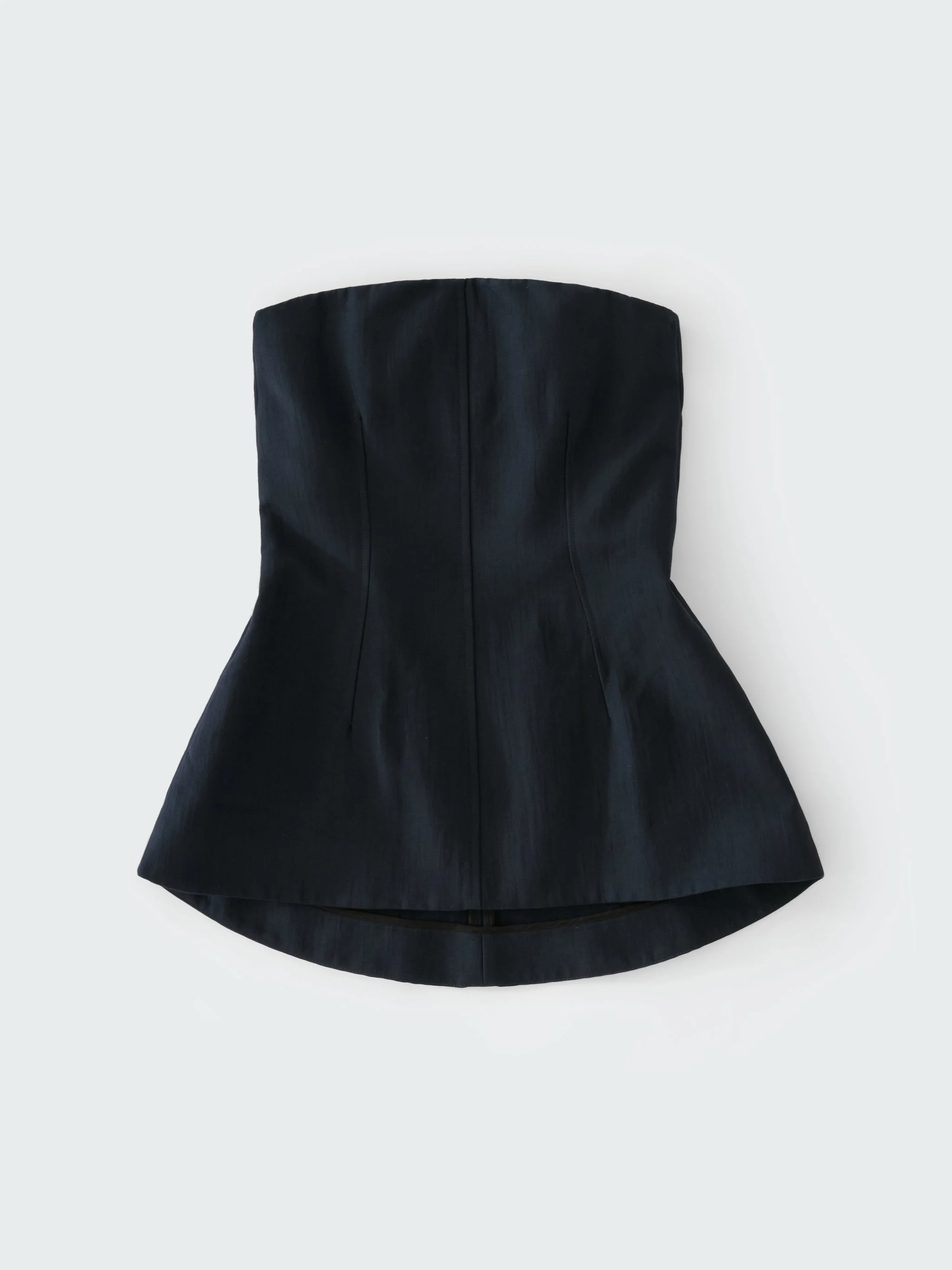 Studio Nicholson leans into traditional corsetry to create the Arles strapless top. Cut from our tumbled double cotton fabric to give a rounded hand feel, it has an internal corset with boning that accentuates the fabric choice and amplifies the sculptural silhouette. DETAILS - Internal corset with boning - Sculptural silhouette - Rear invisible back zip fastening - Wear it with the matching Fellini PantNataly is 5'10" / 177 cms and wears a size UK8 CARE 95% Cotton 5% Polyamide Do NOT Wash | Dry Clean Only Made in Portugal
