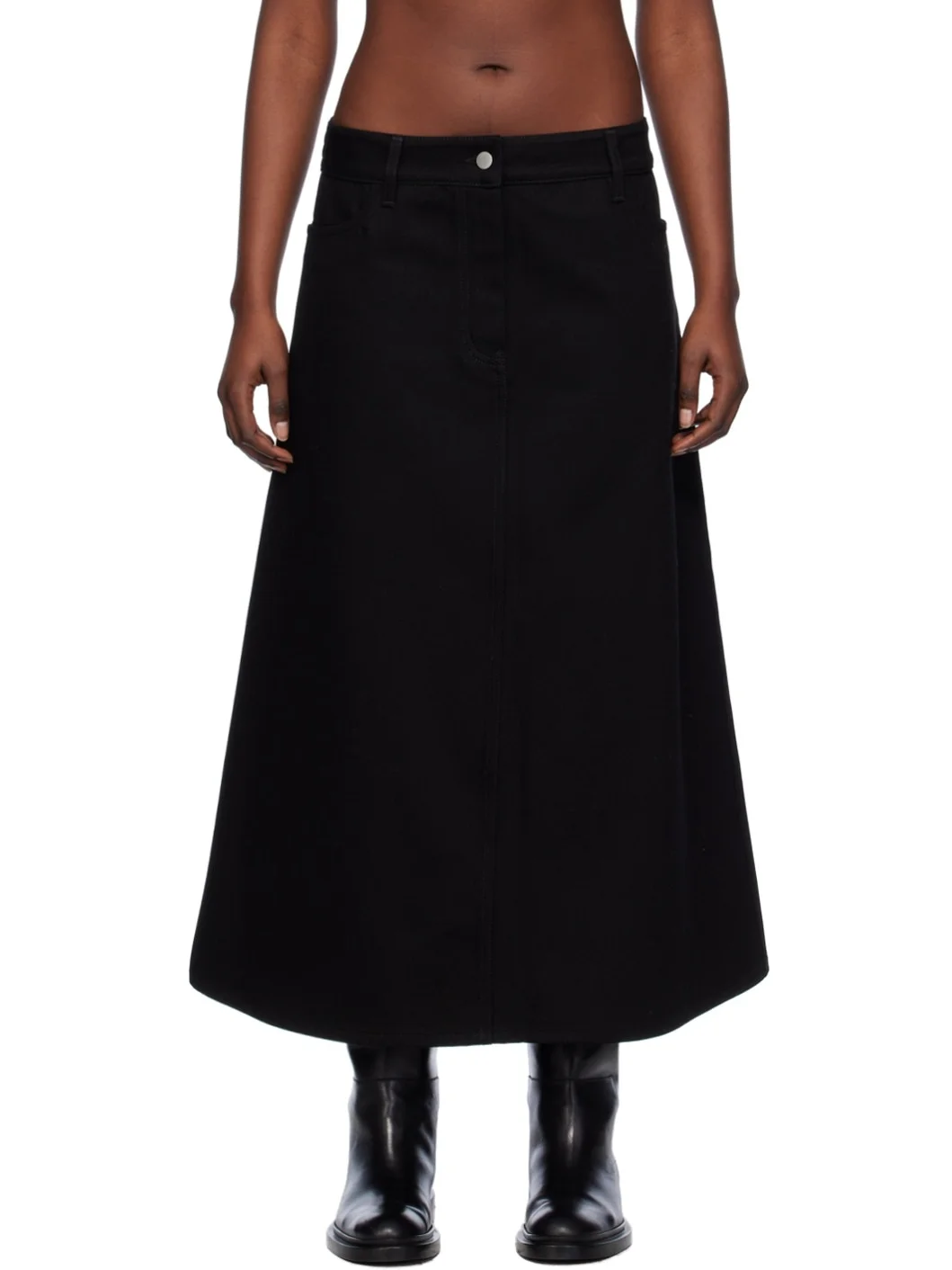 Non-stretch 14 oz selvedge denim skirt. · Four-pocket styling · Zip-fly · Flared hem · Leather logo patch at back waistband Supplier color: Black 52% recycled cotton, 48% cotton. Made in United Kingdom 241608F093002