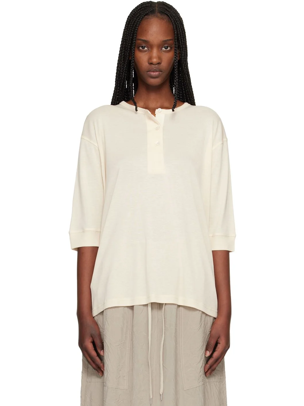 Ribbed lyocell jersey henley. · Crewneck · Three-button placket · Dropped shoulders · Rib-knit cuffs Supplier color: Canvas 100% lyocell. Made in Portugal 261608F110006