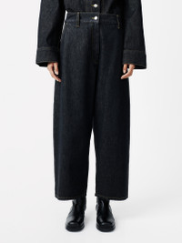 A true SN staple from season to season, our Chalco pants are cut wide and cropped, with a curved leg and dropped crotch. Here they are constructed from a rigid Italian denim with a strong salt and pepper grain and tobacco thread at the seams. DETAILS - Exaggerated curved leg - Button waist - Generous fit - Garment dyed recycled denim - Wear it with the matching Tahoe Denim Jacket Louise is 5'11"/ 177.8 cms and wears a UK8 CARE 100% Organic Cotton Wash at 30°C | Warm Iron