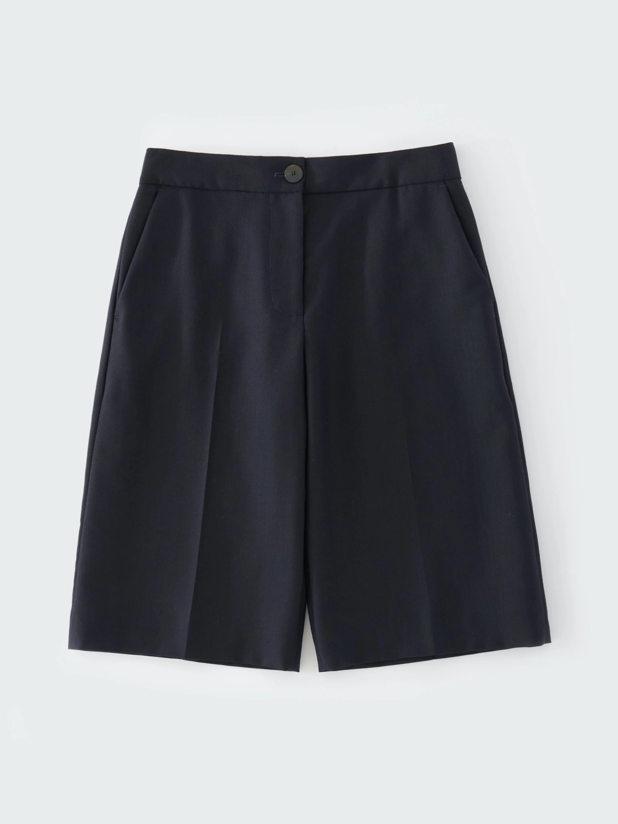 These knee-length tailored shorts are made in a lightweight and breathable tropical wool. Fully lined, The Cabra Shorts feature classic tailoring details, including trouser waist-banding, a hard-pressed crease at the front, and Italian pockets at the sides with welt pockets at the back. They are mid to low-rise and have a straight fit with a slight flare at the knee. DETAILS - Woven at British heritage mill Alfred Brown - Fully lined - Italian pockets at the sides - Welt pockets at the back - Wear it with the matching Wilton Shirt Louise is 5'11"/ 177.8 cms and wears a UK8 CARE Main Fabric: 100% Wool Lining: 100% Viscose Dry Clean Only Made in Portugal