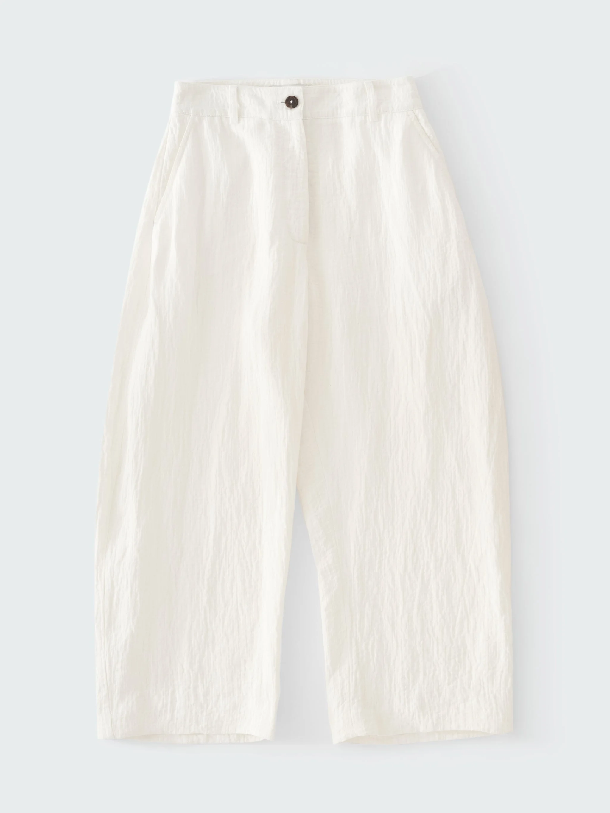 A true SN staple from season to season, our Chalco pants are cut wide and cropped, with a curved leg and a dropped crotch. Here they are constructed from an Italian-shrunk double linen that’s woven with elements of cotton, then tumbled to create a textured, washed-down look. DETAILS - Exaggerated curved leg - Button and zip fastening - Side slant pockets - Back patch pockets - Wear it with the matching Tuttle ShirtXinyue is 5'11" / 180cms and wears a size UK8 CARE 99% Linen 1% Cotton Hand Wash | Dry Clean Made in Portugal