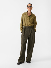 Studio Nicholson’s modern take on traditional tailoring continues with the Chatto pants. A move on from our staple Doring silhouette, they’re cut from grain de poudre – a dry, matte fabric made with combed wool yarns that recalls classic tailoring cloth – and shaped with a belted mid waist that can be used to amplify the voluminous curve in the leg. DETAILS - Belted waist - Slant pockets - Curved leg - Rear buttoned jet pockets - Wear it with the matching Araz JacketNataly is 5'10" / 177 cms and wears a size UK8 CARE Main Fabric: 88% Wool 12% Polyamide Lining: 51% Viscose 49% Cotton Do NOT Wash | Delicate Dry Clean Only Made in Portugal