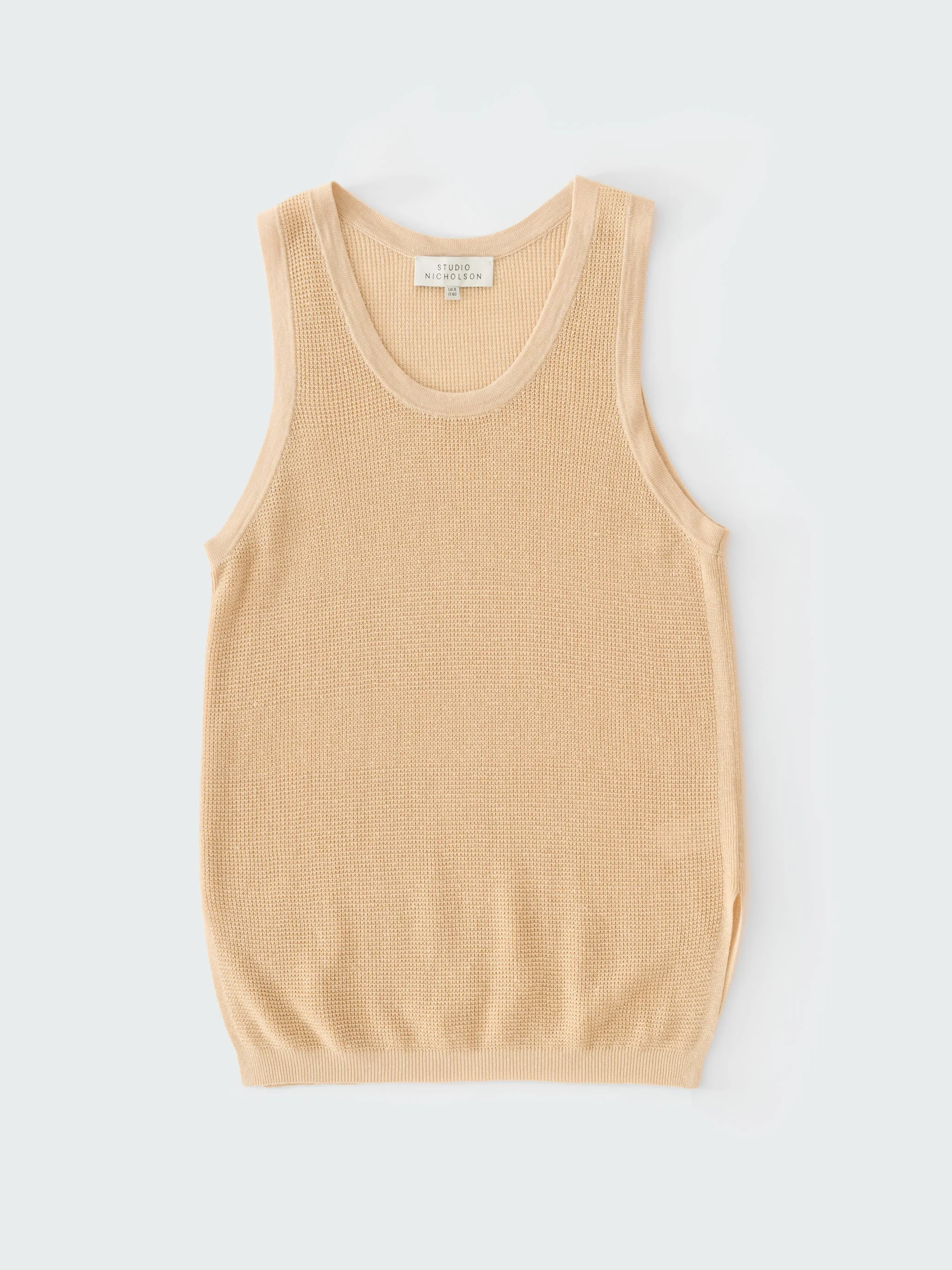 A brand-new style and fabrication for SN, the Cilla vest draws inspiration from a classic men’s vest. It’s shaped to an oversized silhouette and made from a semi-sheer, fine gauge waffle knit textured linen blend that gives a dry, summer hand feel. Ideal for layering, the Cilla is finished with a ribbed neckline, cuffs, and hem. DETAILS - Waffle knit - Side splits - Ribbed trims - Oversized fit CARE 68% Linen 32% Viscose Hand Wash | Delicate Dry Clean